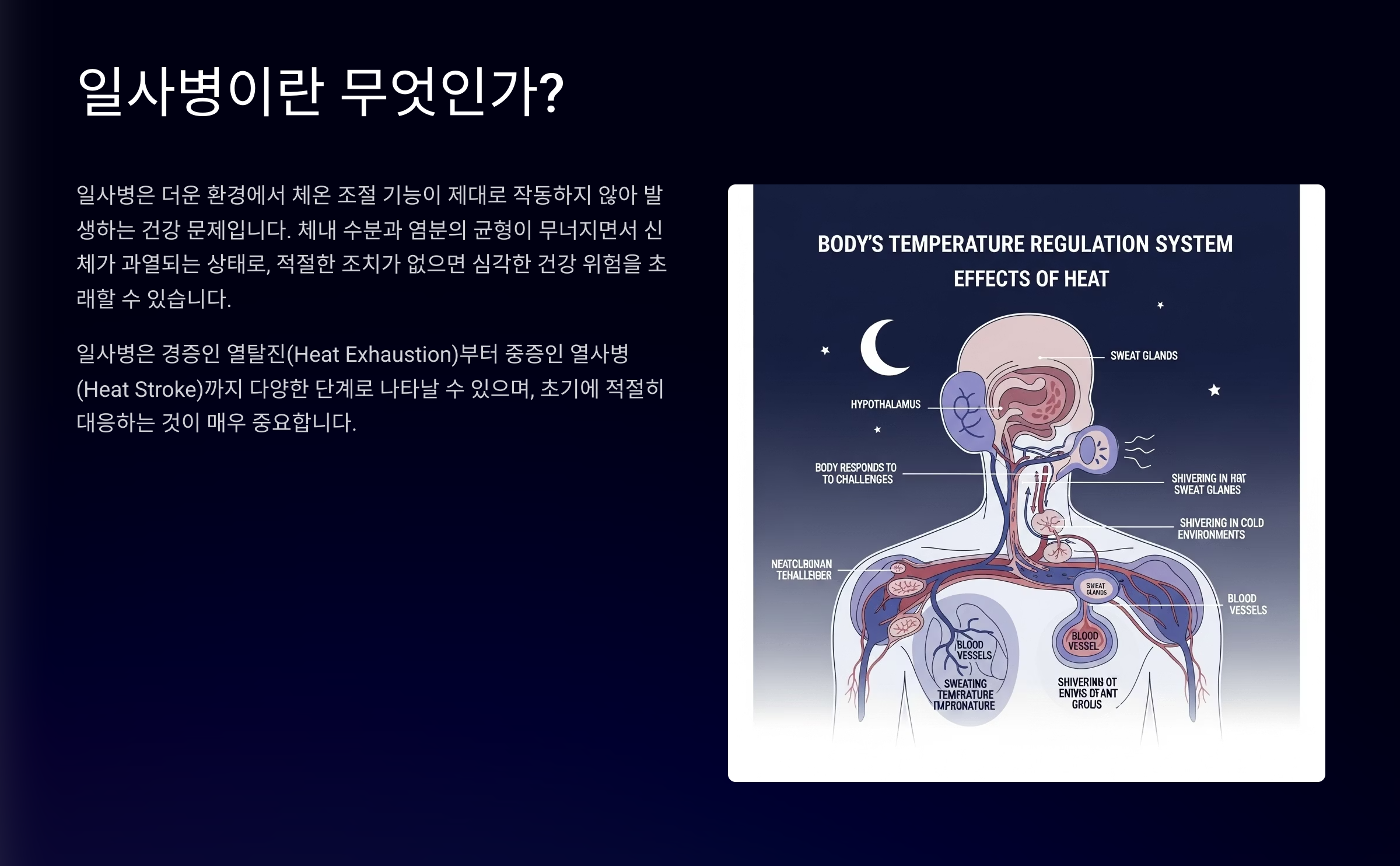 | 취약 계층 | 체온 조절 능력 미숙/저하 | 어린이, 노인, 야외 근로자 |