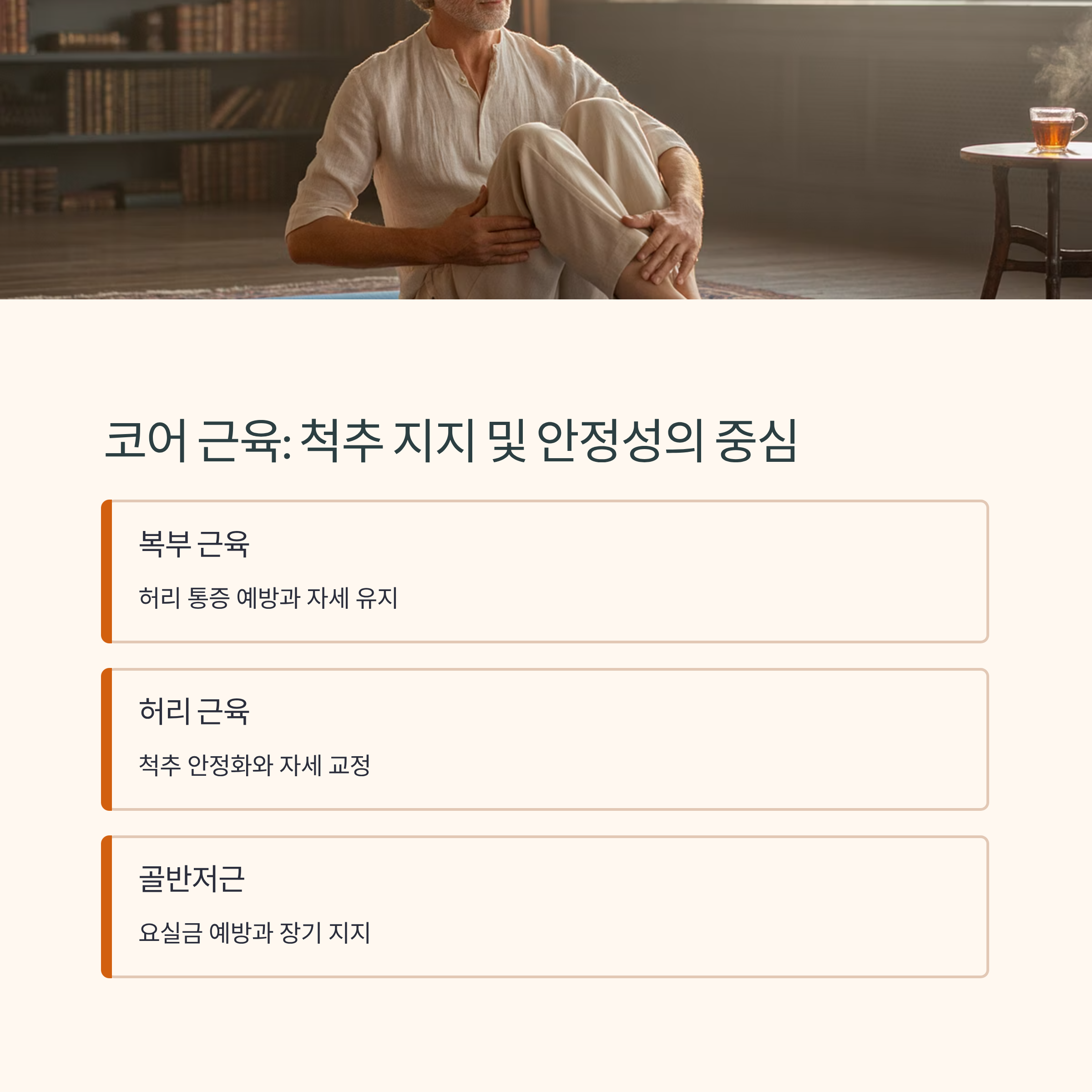 코어 근육은 복부, 허리, 엉덩이를 아우르는 몸의 중심 근육이에요. 코어 근육이 약하면 허리 통증이 생기기 쉽고, 몸의 균형이 무너져 낙상 위험이 높아집니다. 튼튼한 코어는 안정적인 자세 유지와 안전한 움직임의 기반이 됩니다.