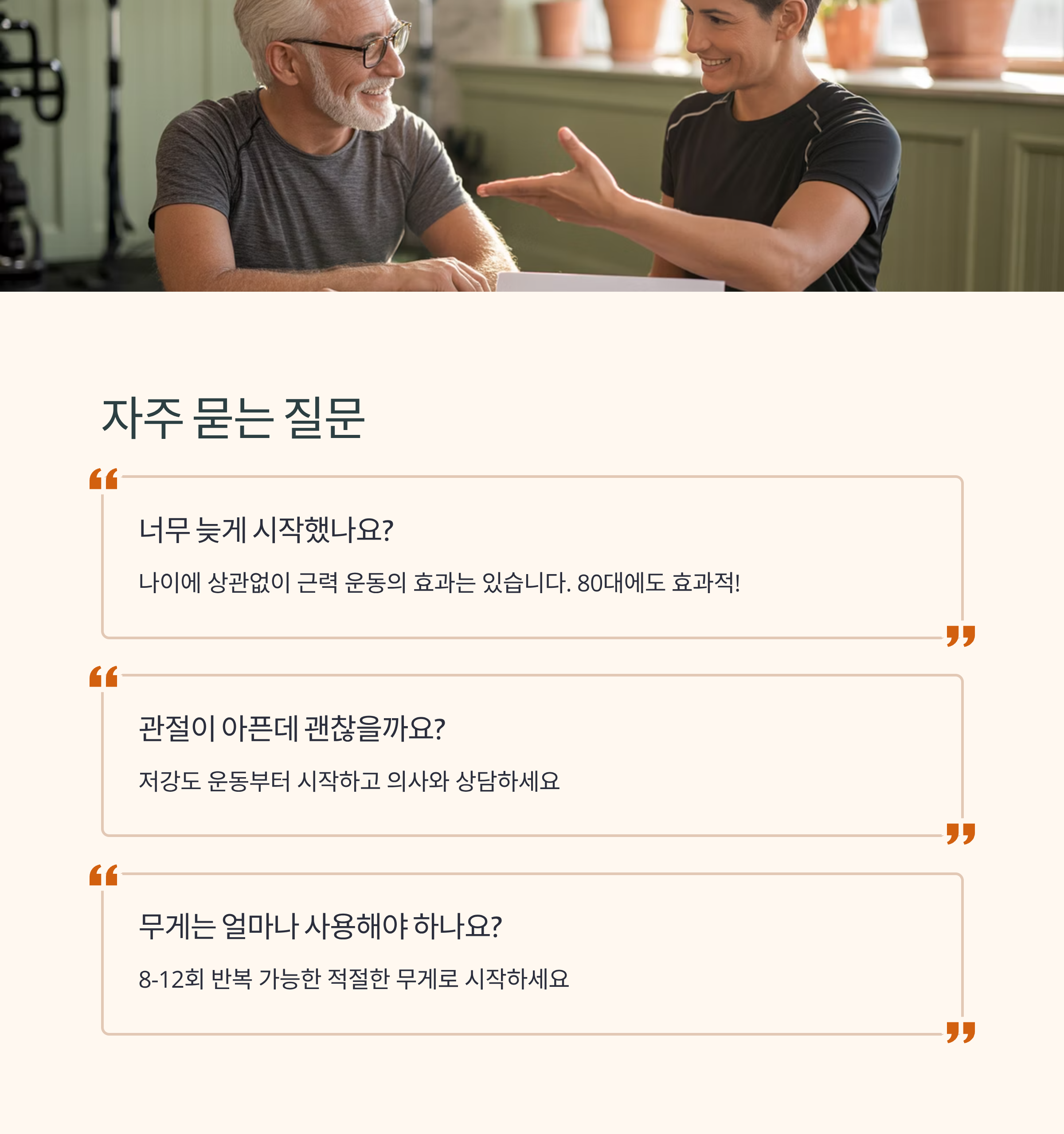A5. 지병이 있거나 만성 통증이 있는 경우, 운동을 시작하기 전 반드시 의사와 상담해야 합니다. 운동 방법이나 자세가 어렵다면 전문 트레이너나 재활 전문가의 지도를 받는 것이 부상 예방과 효과 증진에 좋습니다. 또한, 근육량 감소가 심하거나 근감소증 진단을 받았다면 의료기관의 전문적인 관리가 필요합니다.