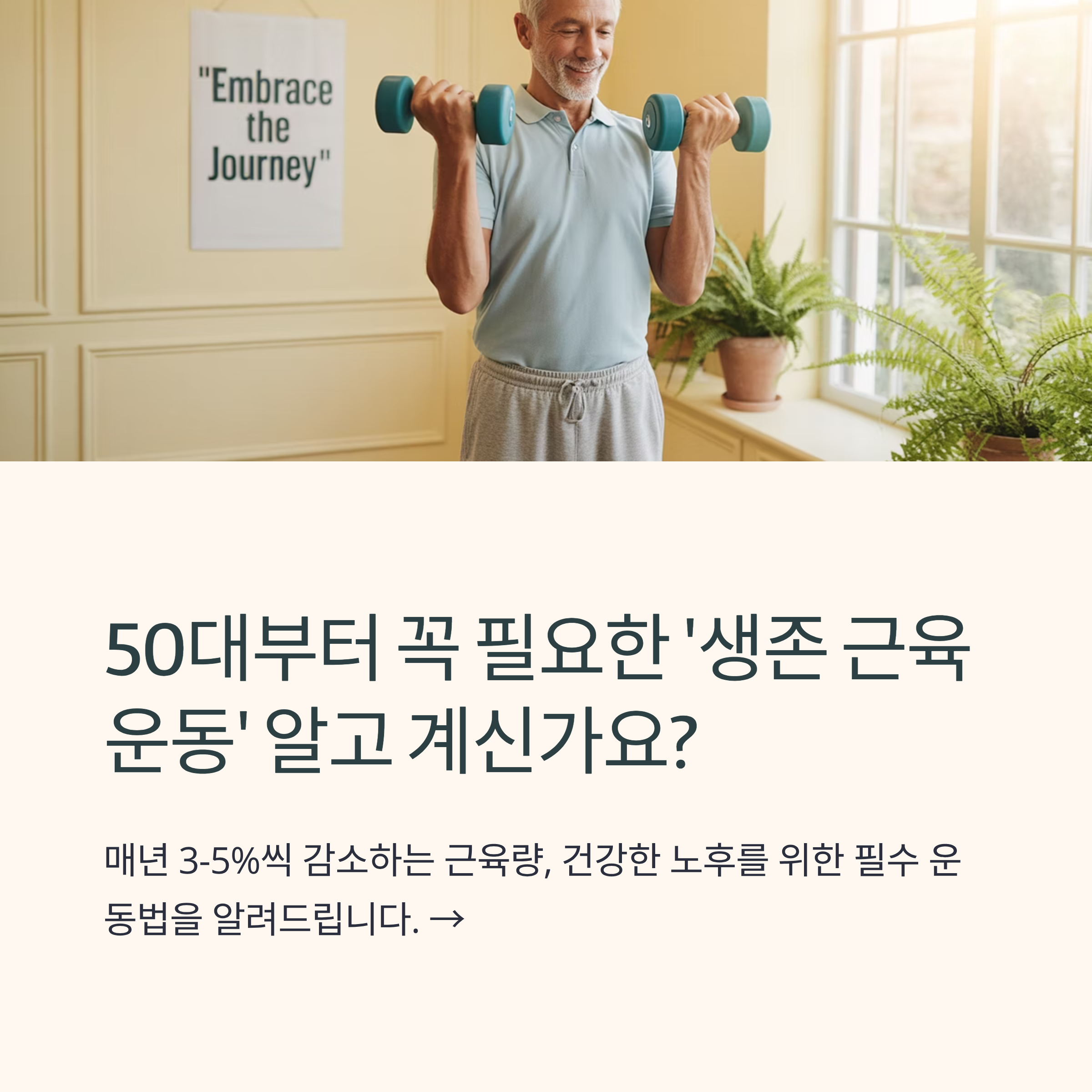 근육은 50대 이후의 삶의 질을 좌우하는 '보물'입니다. 지금부터라도 꾸준히 관리하여 활기찬 노년을 준비하세요. 💡