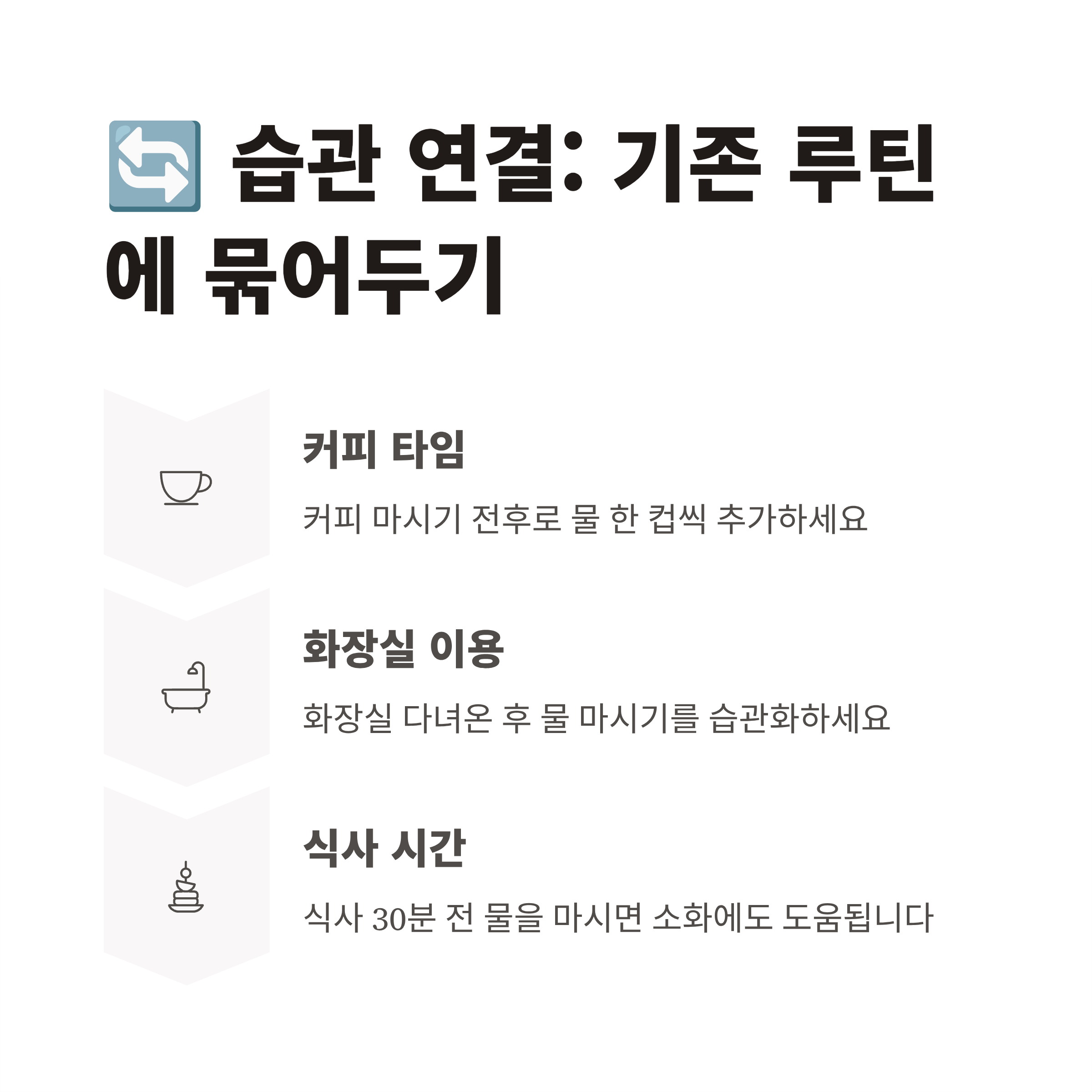 자신만의 '습관 고리'를 만들어보세요. 뇌가 저항할 틈도 없이 자연스럽게 물을 마시게 될 거예요.