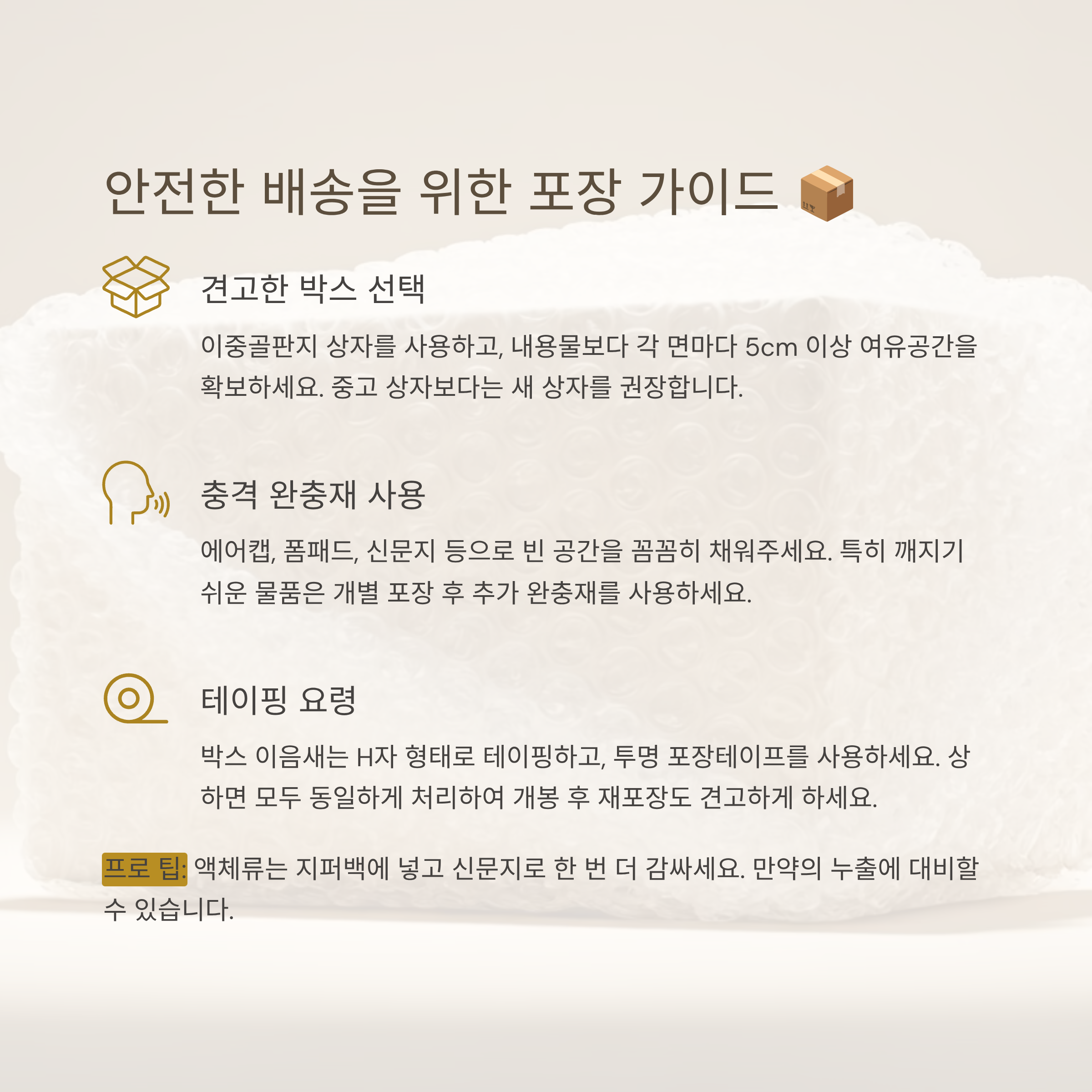 꼼꼼한 포장은 여러분의 소중한 물건을 안전하게 지키는 마지막 방어선입니다. 충분한 시간과 정성을 들여 포장하세요!
