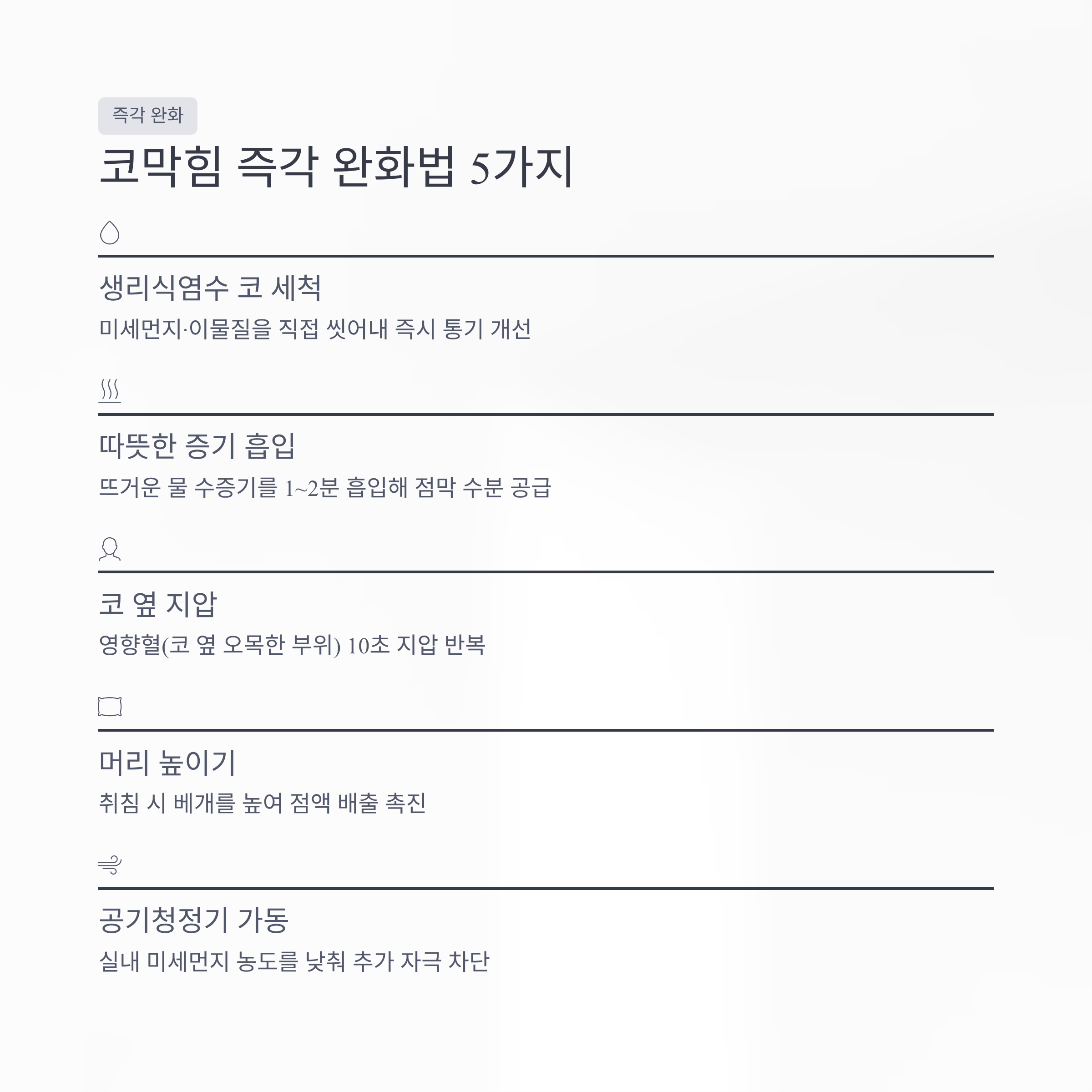 병원에 가기 전, 집에서 바로 시도해볼 수 있는 코막힘 완화법을 소개합니다. 효과가 빠른 순서로 정리했습니다.