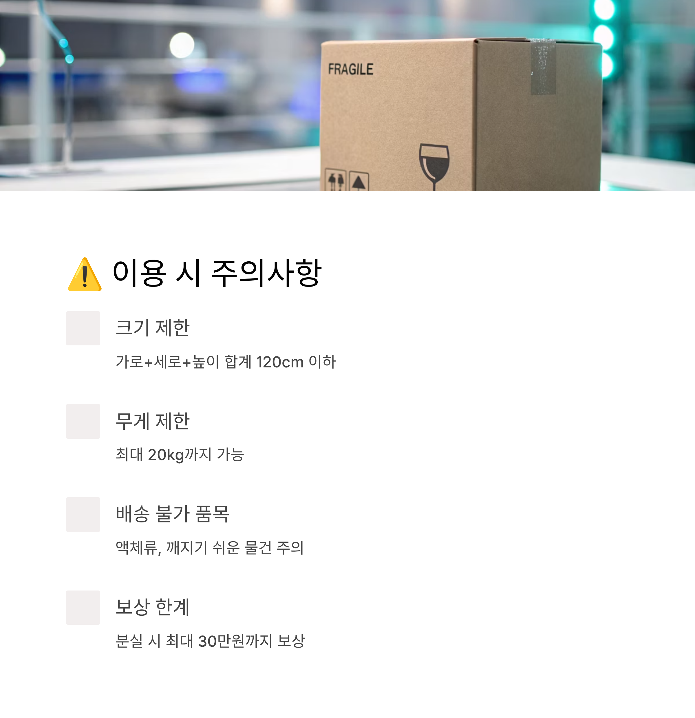 | 주의 사항 | 파손/변질/고가품/액체류 등 접수 불가, 동일 브랜드 편의점 간 배송 | 파손/변질/고가품/액체류 등 접수 불가, 동일 브랜드 편의점 간 배송 | 꼼꼼한 포장, 물품 제한 확인 |