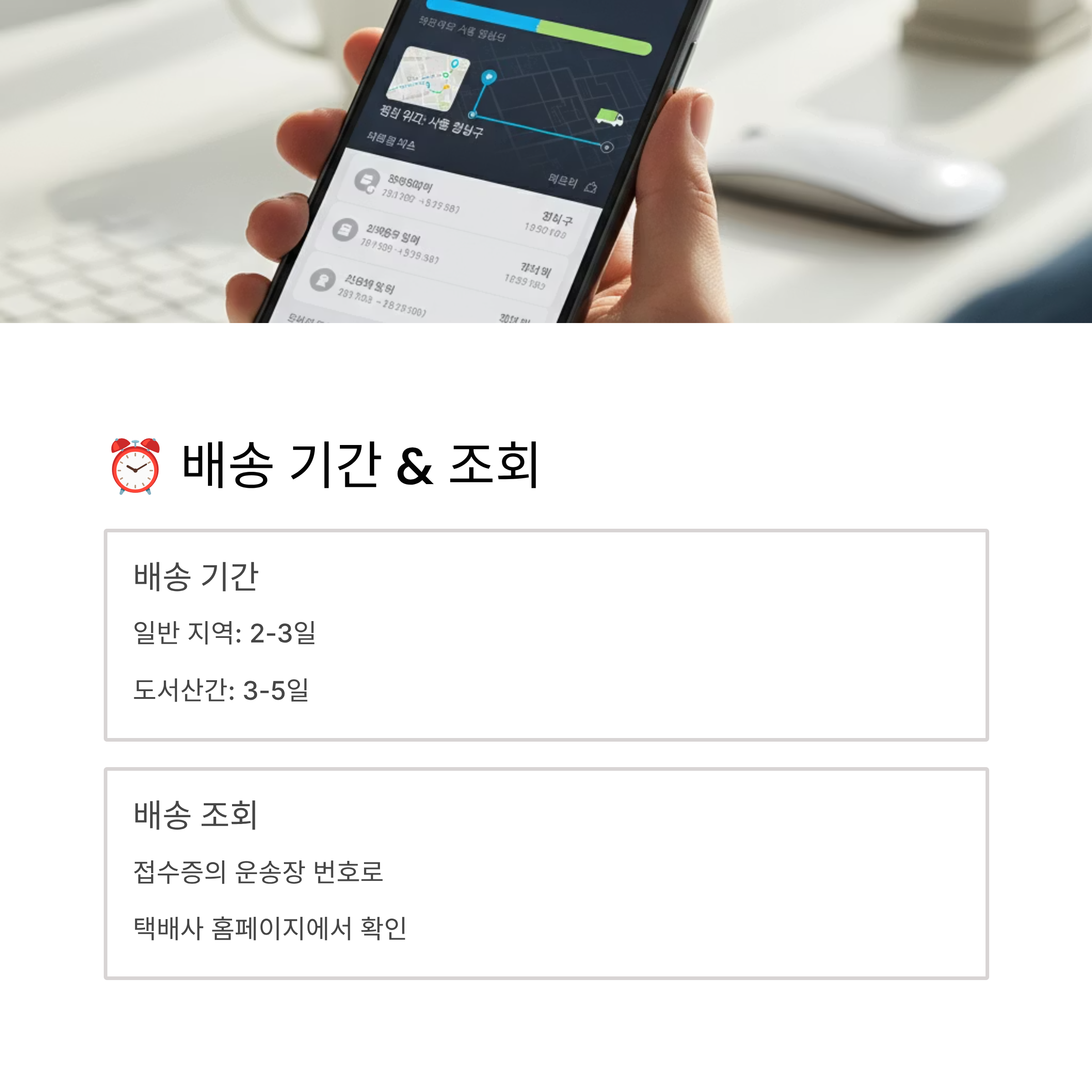 - 주말 및 공휴일: 주말에도 배송이 진행되지만, 공휴일이 끼어있거나 특정 지역(도서산간, 제주도 등)의 경우 배송이 지연될 수 있습니다.