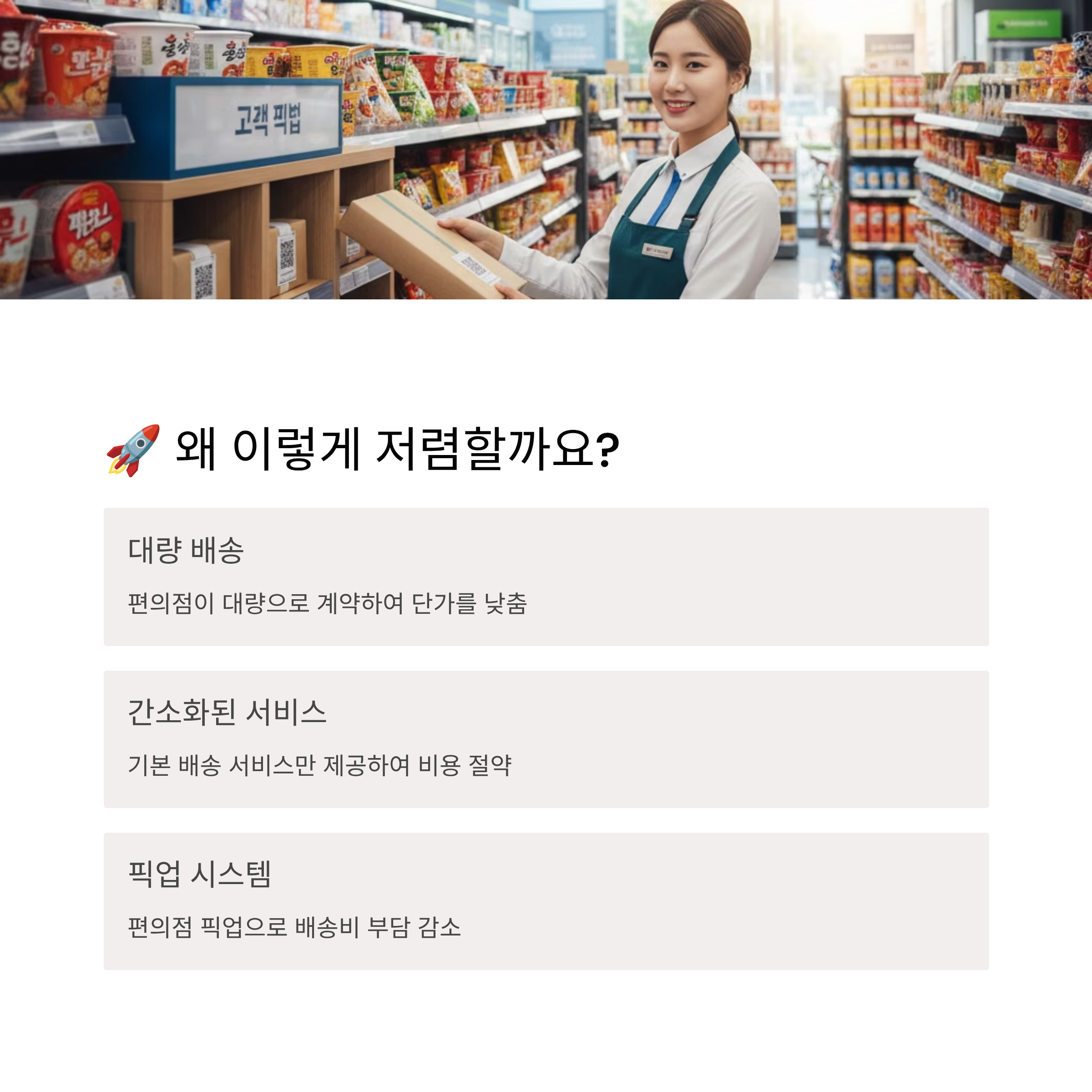 | 기존 물류 시스템 활용 | 편의점 상품 배송 차량을 함께 활용하여 인프라 비용 절감 |