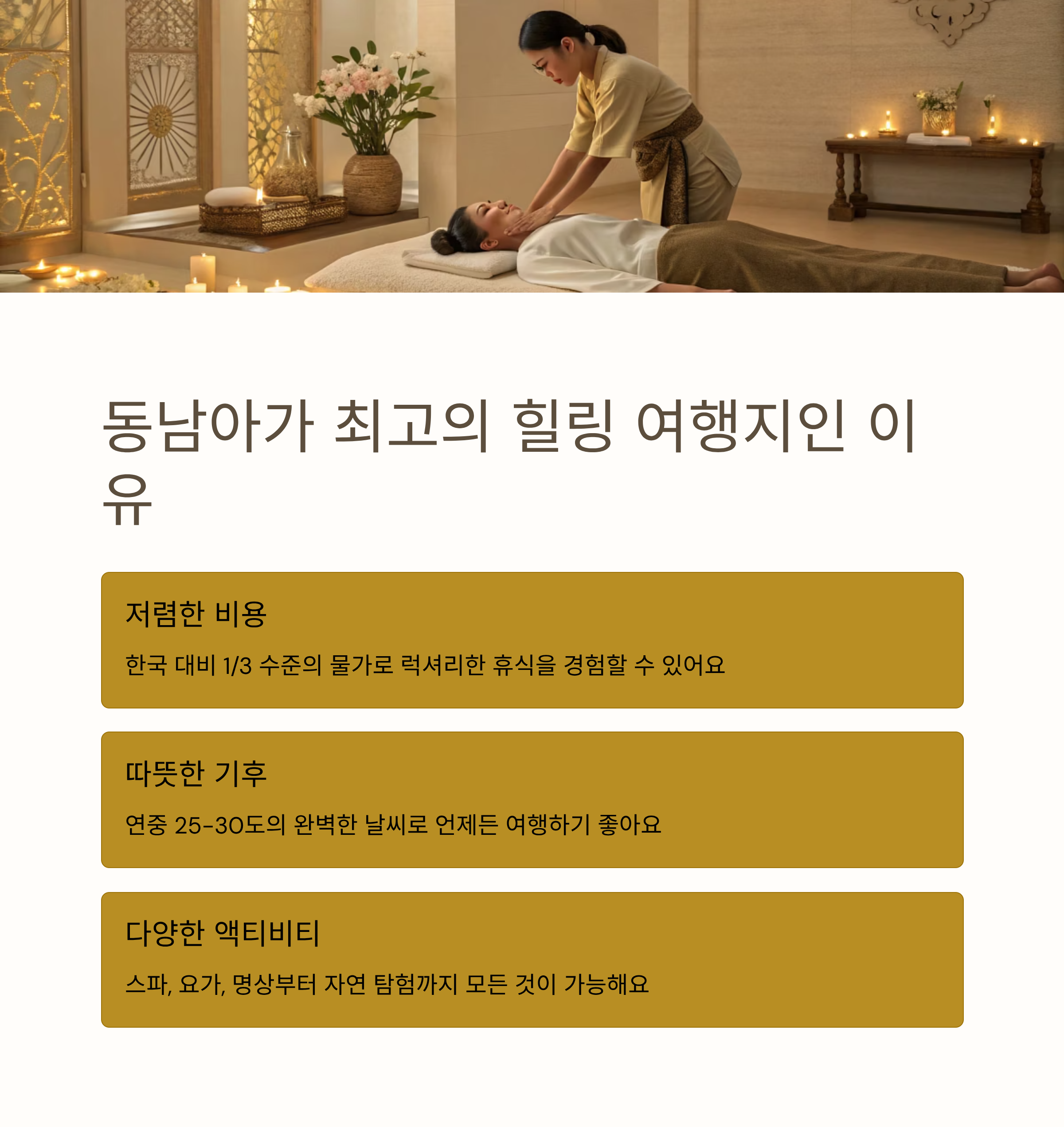 수많은 여행지 중에서도 동남아가 힐링 여행지로 꾸준히 사랑받는 이유는 명확합니다.