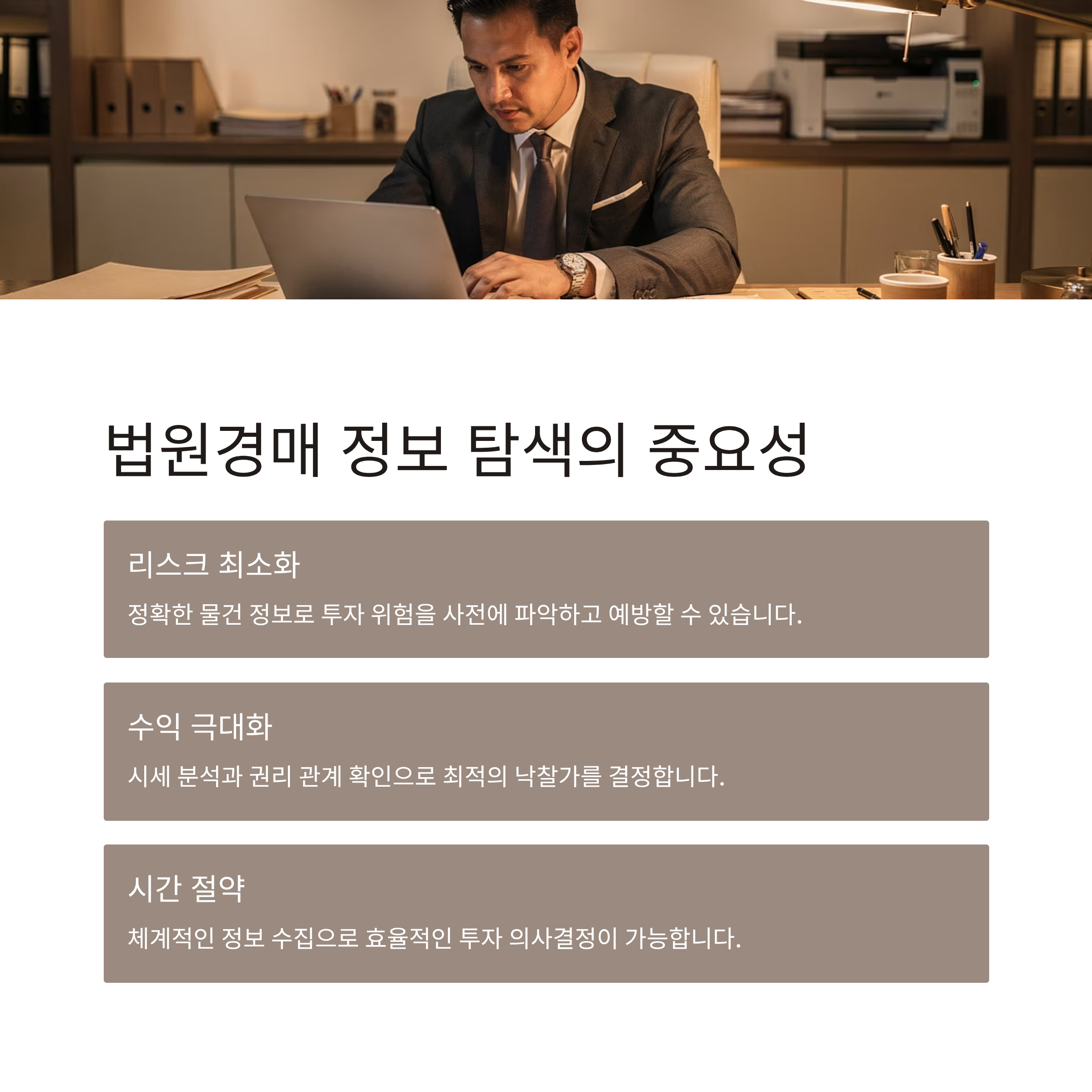 | 중요성 | 권리 분석, 시세 파악, 입찰가 산정, 위험 요소 방지 등 성공 경매의 첫걸음 | 정보는 곧 수익! 철저한 탐색이 리스크 감소로 이어짐 |