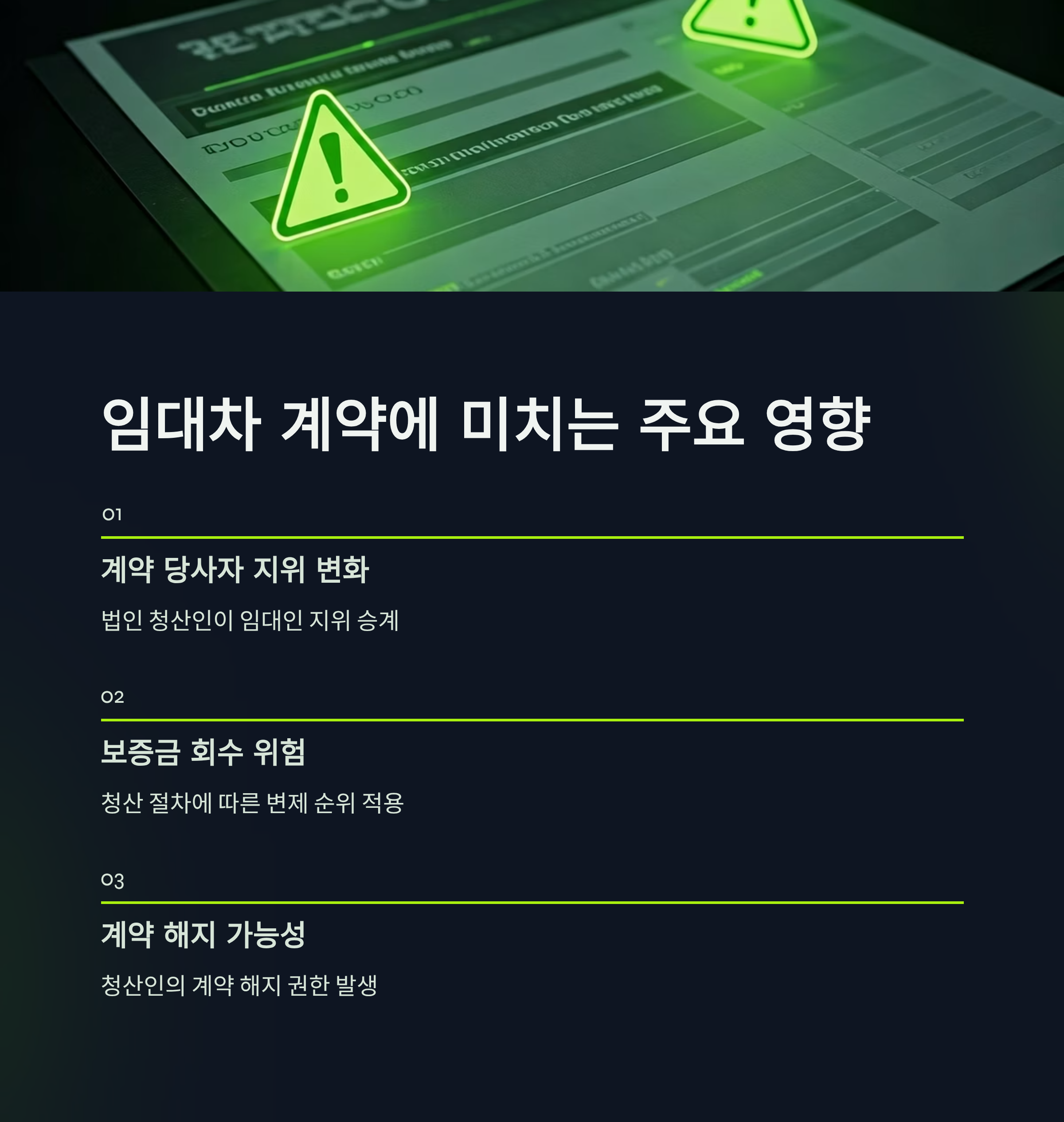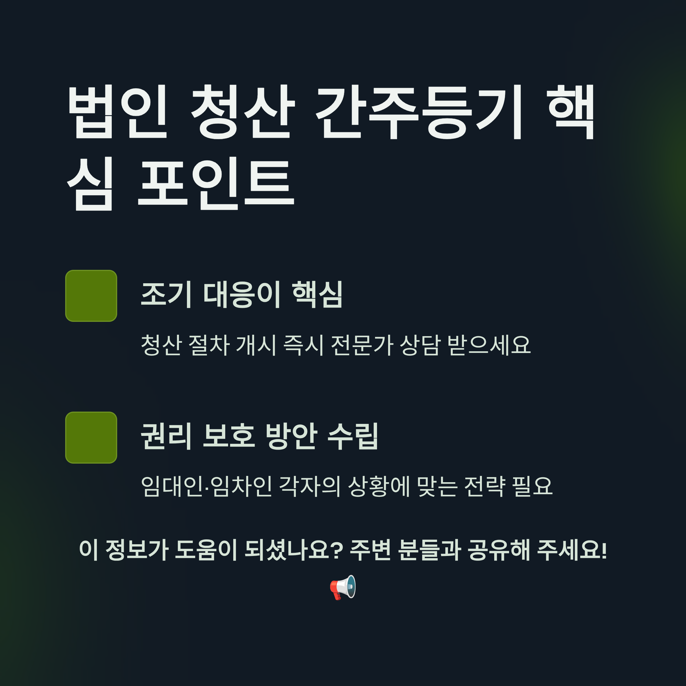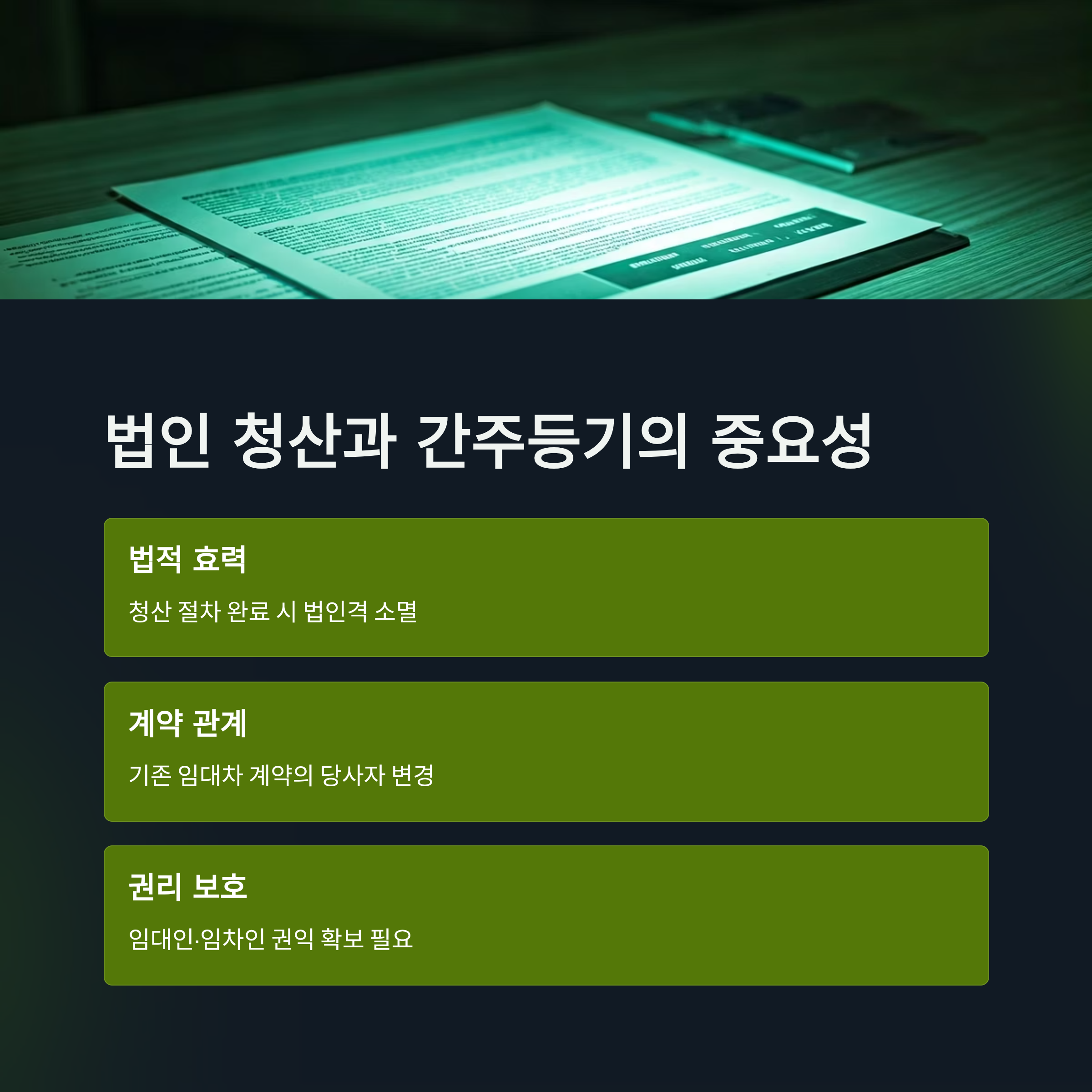 - 특히 법인 명의로 임차한 부동산의 경우, 법인이 해산 간주되면 임대료 납부, 시설 관리, 계약 만료 시 원상복구 등 계약 의무 이행이 어려워질 수 있습니다.