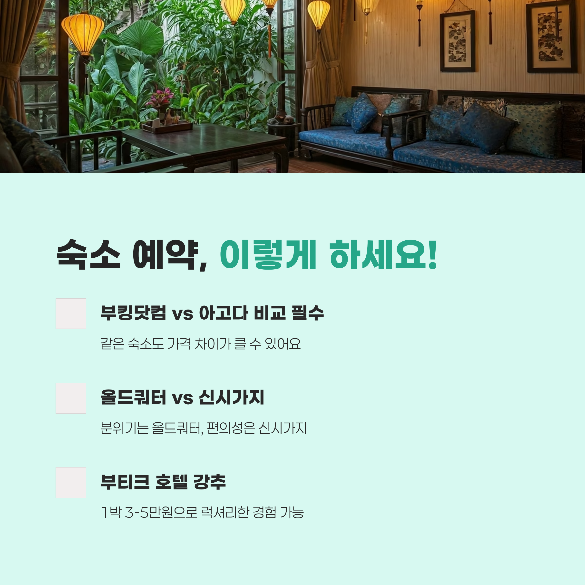스마트한 숙소 예약으로 베트남 여행의 만족도를 높이세요. 🏨