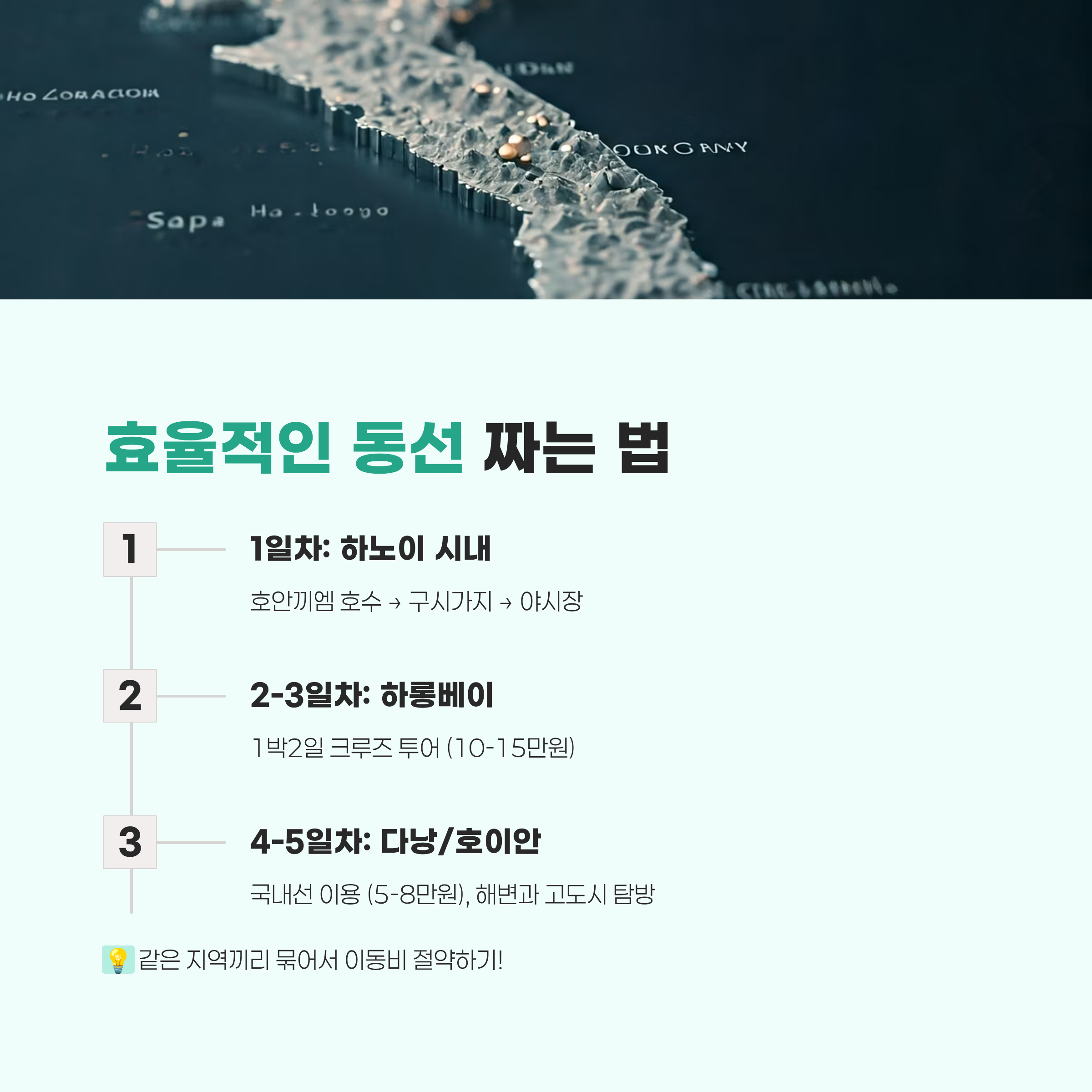 베트남은 세로로 길게 뻗은 나라이므로, 효율적인 동선 계획이 시간과 비용을 절약하는 데 필수적입니다. 북부-중부-남부 또는 그 반대 방향으로 이동하며 불필요한 동선 낭비를 줄이는 것이 좋습니다.