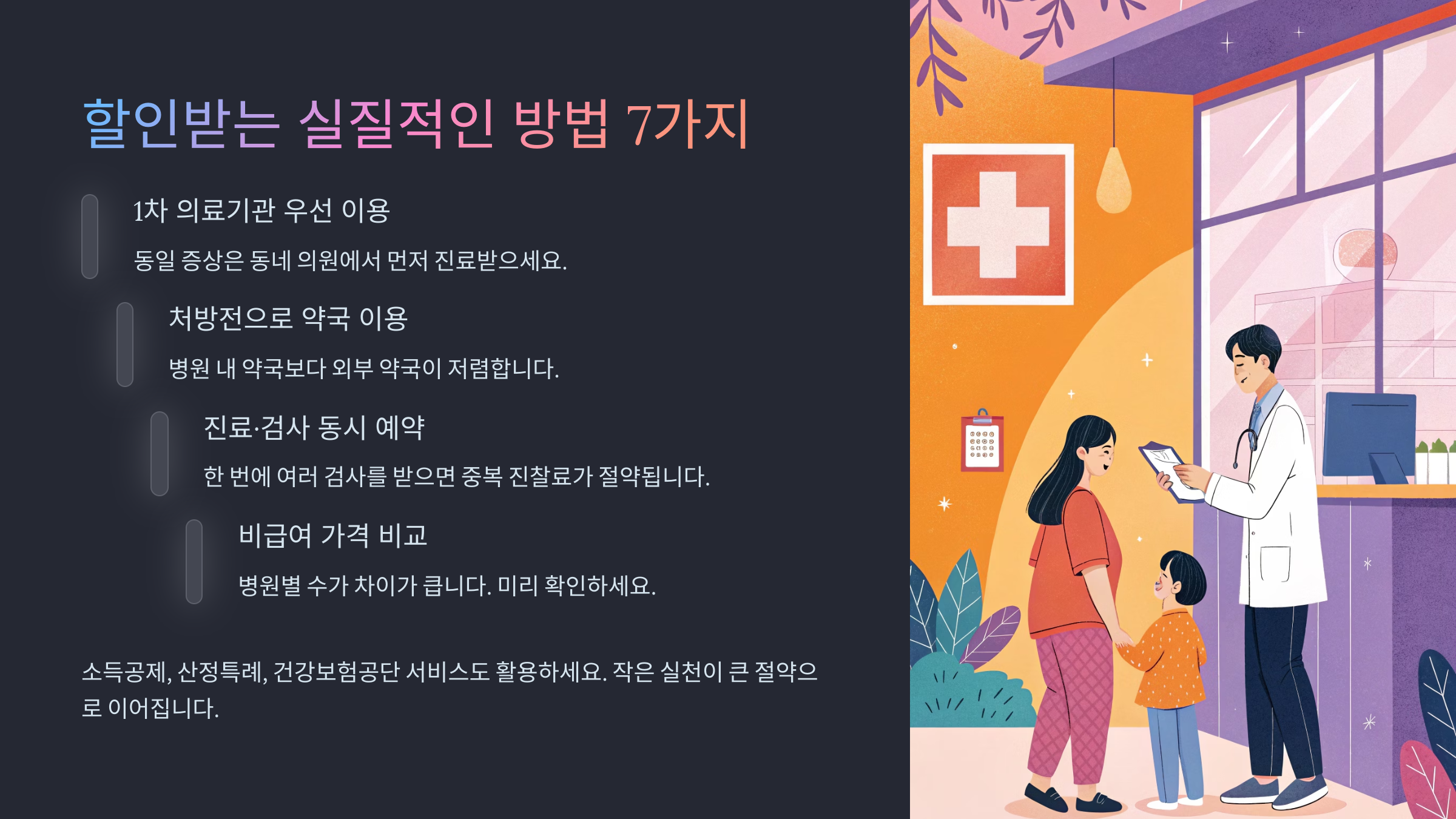 병원비를 줄이려면 막연히 ‘싼 병원’을 찾기보다, 구체적인 전략이 필요해요. 실제로 많은 사람들이 몰라서 놓치는 할인 방법들이 꽤 많거든요. 여기서 소개하는 7가지 방법은 실질적으로 적용할 수 있는 것들이에요. 누구나 한 번쯤은 활용 가능한 내용이니 꼼꼼히 읽어보세요! ✨