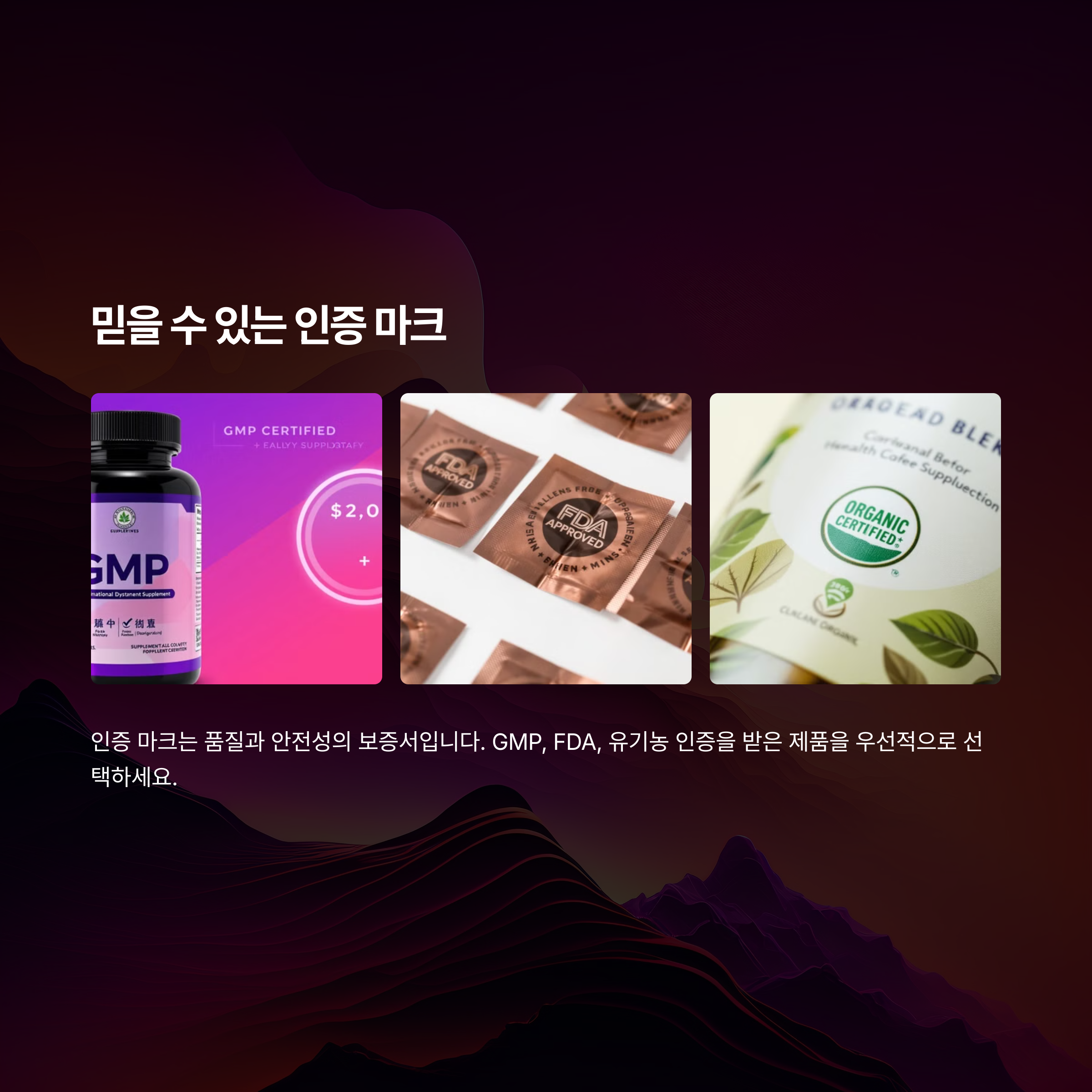 마지막으로 **제품의 인증 마크**를 확인하는 것이 중요합니다. FDA 승인, 유기농 인증, GMP 마크 등 신뢰할 수 있는 기관의 인증을 받은 제품은 **품질과 안전성이 검증된 제품**이므로 보다 안심하고 섭취할 수 있습니다. 또한, 성분의 원산지와 제조 과정도 꼼꼼히 확인하여 믿을 수 있는 제품을 선택하는 것이 중요합니다.