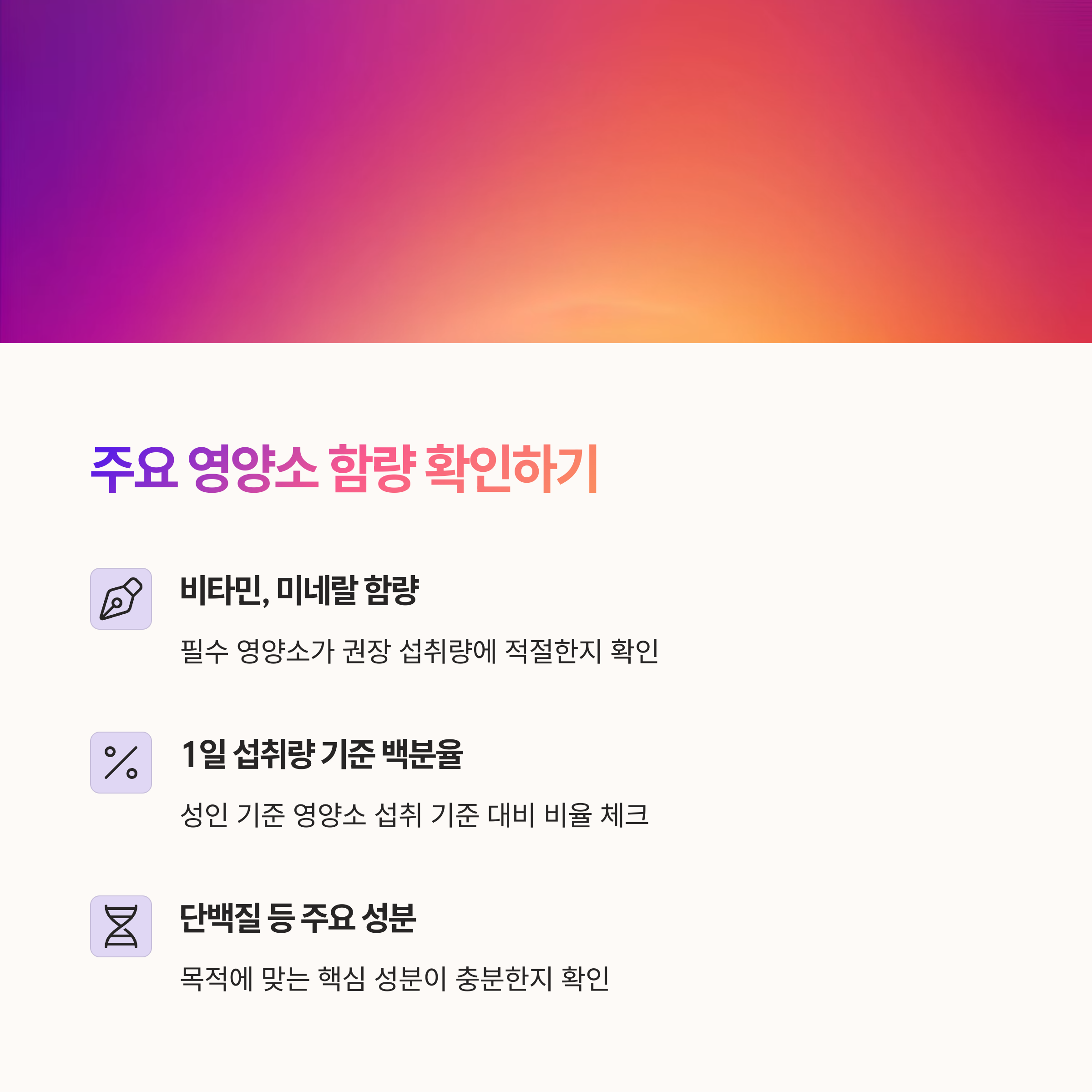 보충제를 선택할 때 가장 중요한 것은 **성분표**를 올바르게 해석하는 것입니다. 우리가 섭취하는 영양소는 **직접적인 건강**에 영향을 미치므로, 제품을 선택할 때는 반드시 성분표를 꼼꼼히 살펴봐야 합니다. 하지만 많은 분들이 성분표를 보며 **어떤 성분이 중요한지**, **어떤 첨가물이 포함되어 있는지** 쉽게 이해하지 못하는 경우가 많습니다. 이번 글에서는 보충제 성분표를 확인할 때 주의해야 할 **핵심 요소**를 **쉽고 자세하게** 설명해 드리겠습니다. 올바른 보충제 선택을 위해 지금부터 함께 알아보겠습니다.