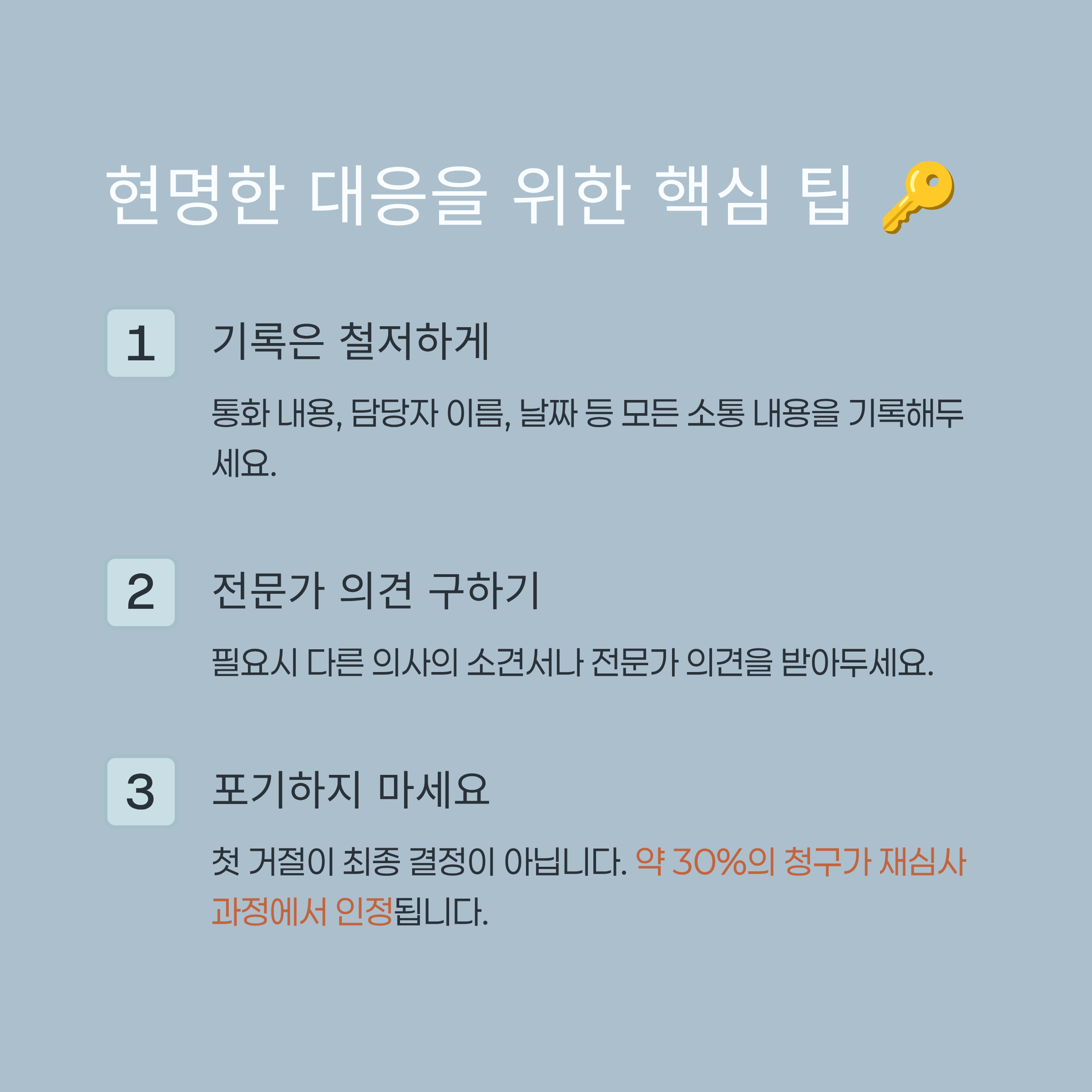 보험금 청구 거절은 누구에게나 당황스러운 상황이지만, 몇 가지 팁을 기억하고 실천하면 현명하게 대응하고 정당한 권리를 찾을 수 있습니다.