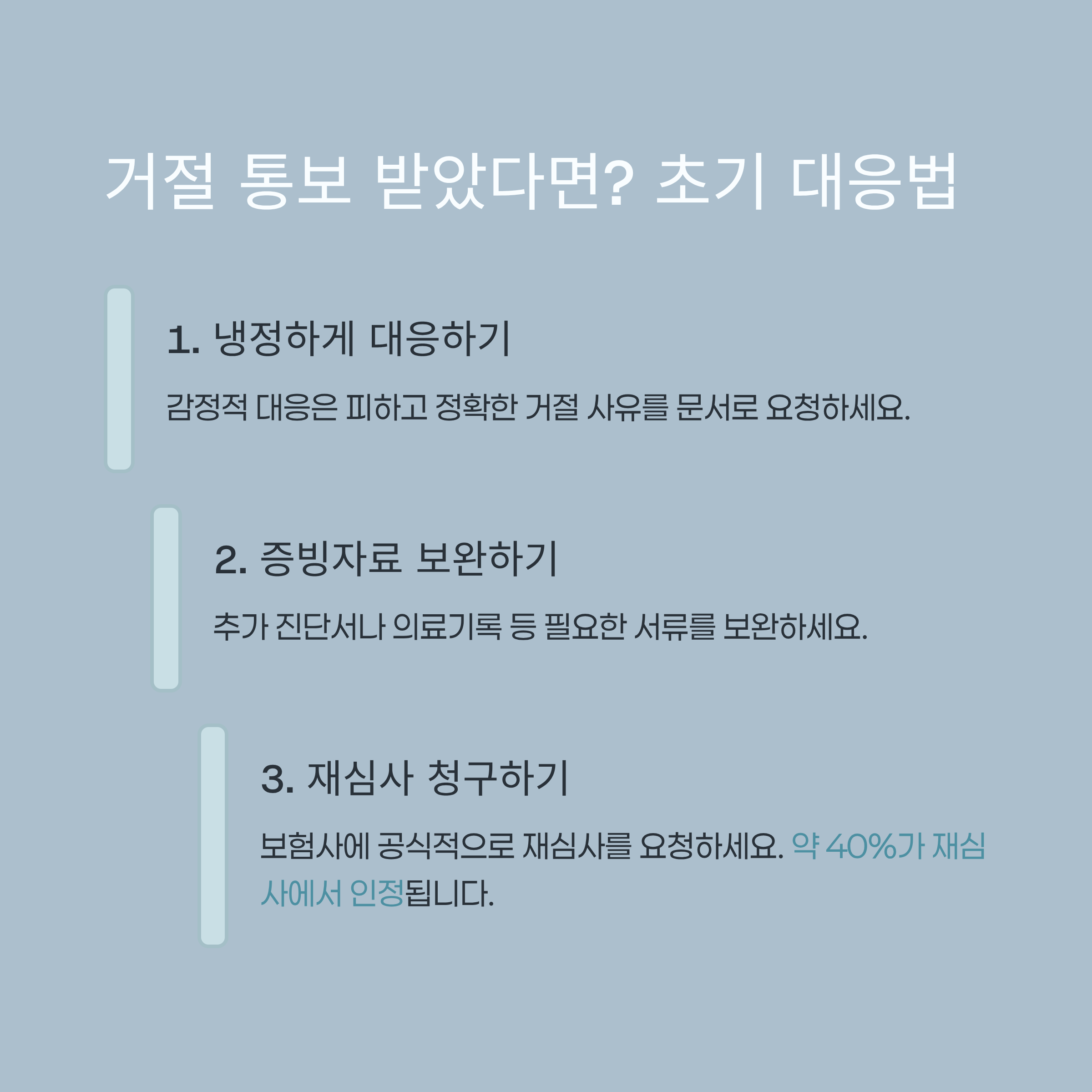 | 약관/증거 재검토 | 약관 재확인, 반박 증거(추가 자료) 확보 | 거절 사유에 맞춰 증거 보강 |