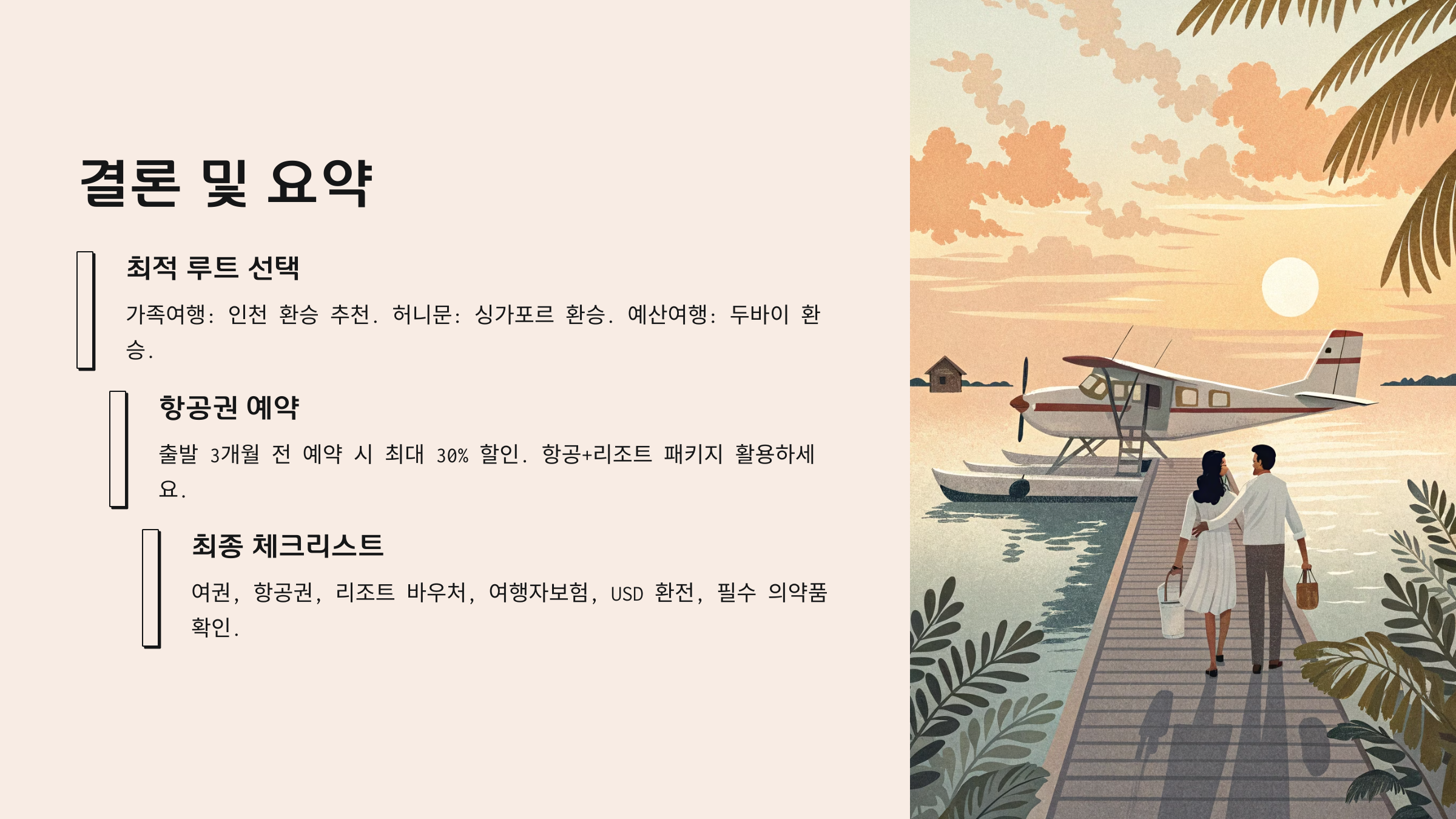 부산에서 몰디브까지의 여정은 단순한 비행이 아닌 하나의 모험입니다. 경유지를 잘 선택하고 계획만 탄탄히 세운다면, 멀게 느껴졌던 그 아름다운 몰디브의 해변이 눈앞에 펼쳐질 거예요.