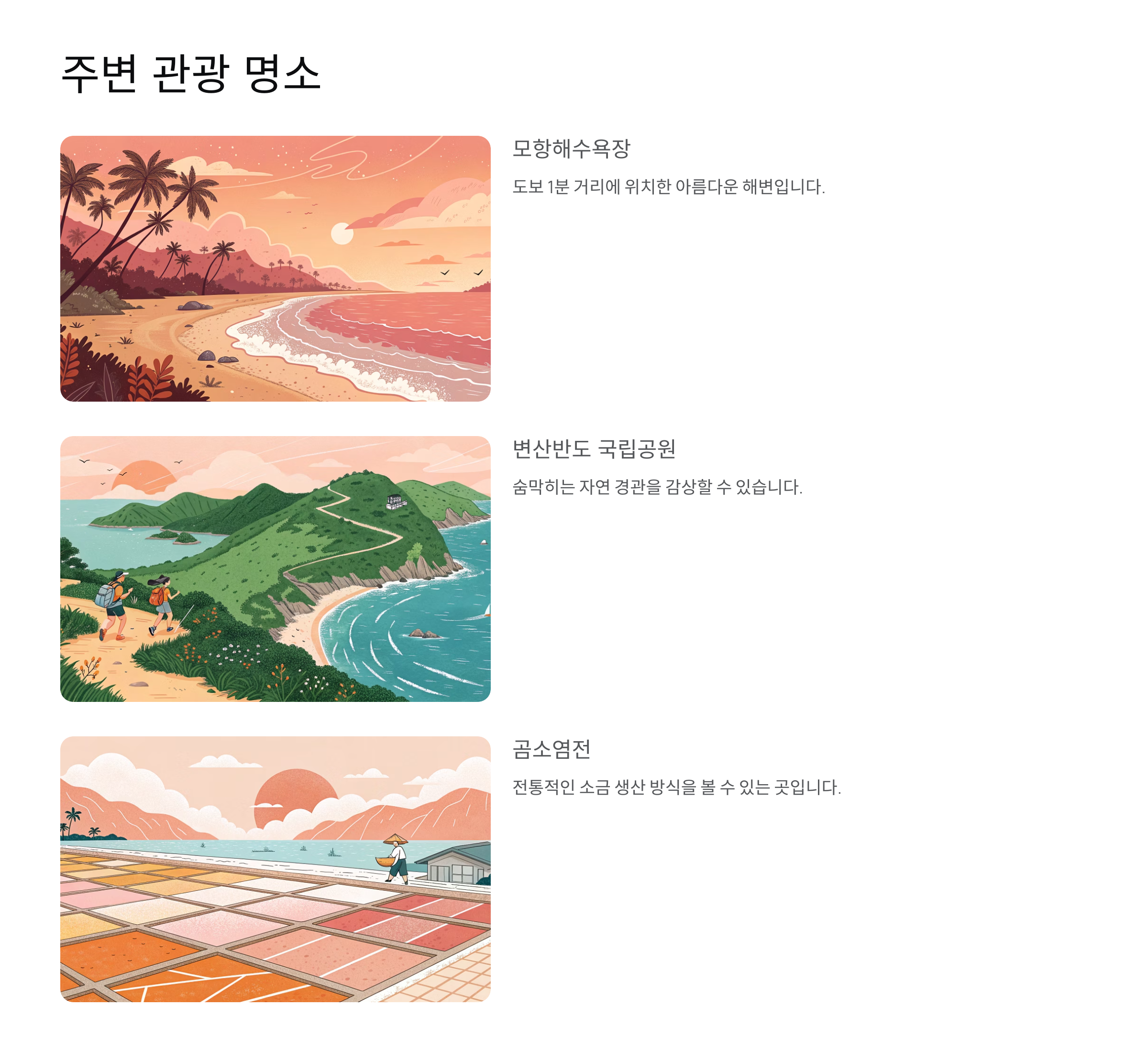 숙소 인근에는 모항해수욕장, 변산반도 국립공원, 곰소염전 등의 자연 경관이 아름다운 명소들이 가득합니다.