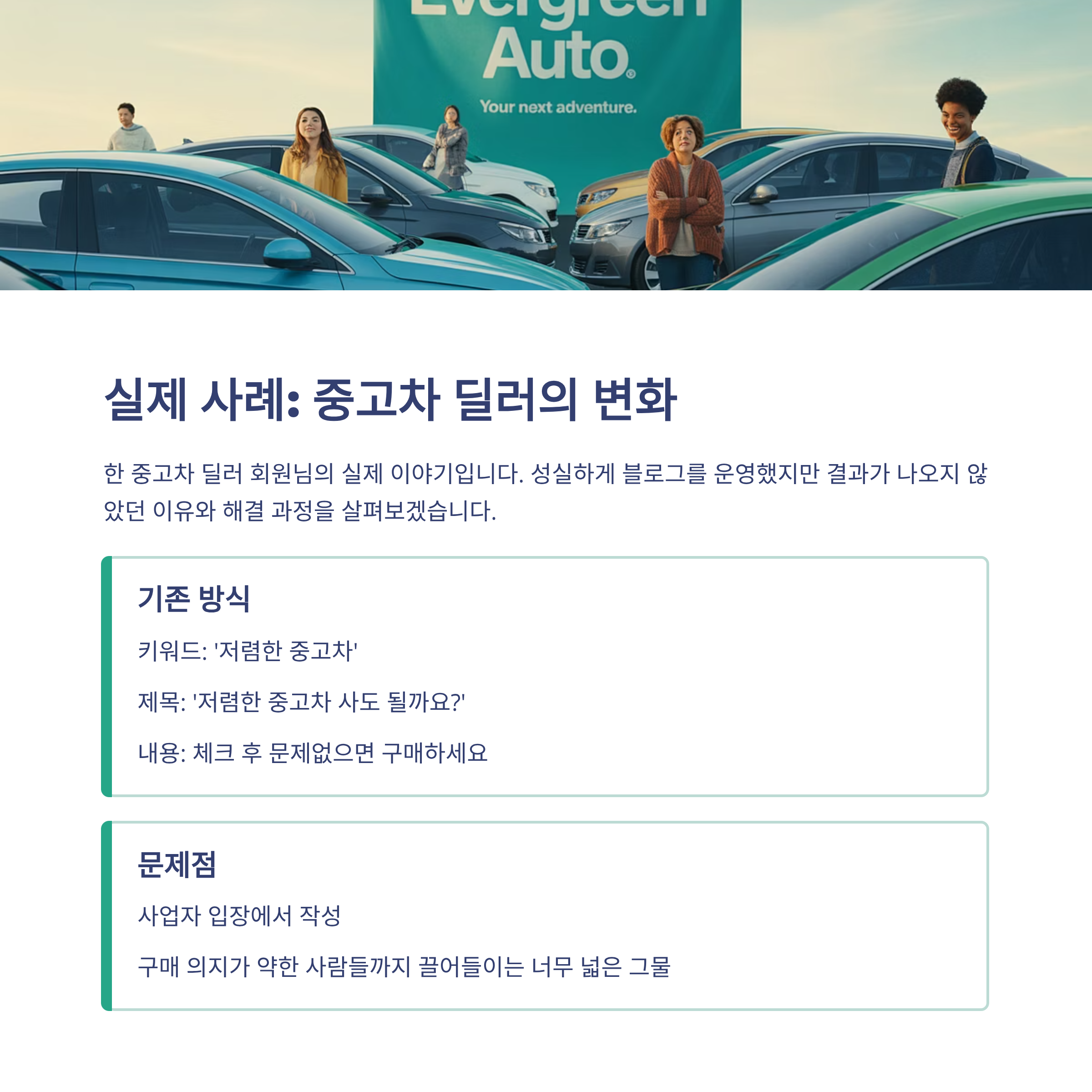 예를 들어, '사회초년생 중고차, 초기비용 400만 원으로 가능!', '사회초년생 레이 되팔아도 80% 돌려받는다고?', '사회초년생 첫차, 선수금 넣을 돈으로 전액 현금 가능!'과 같은 제목들이 탄생할 수 있습니다. 여러분의 블로그 제목은 고객이 검색한 '이유'에 대한 가장 완벽한 '대답'이 되어야 합니다.