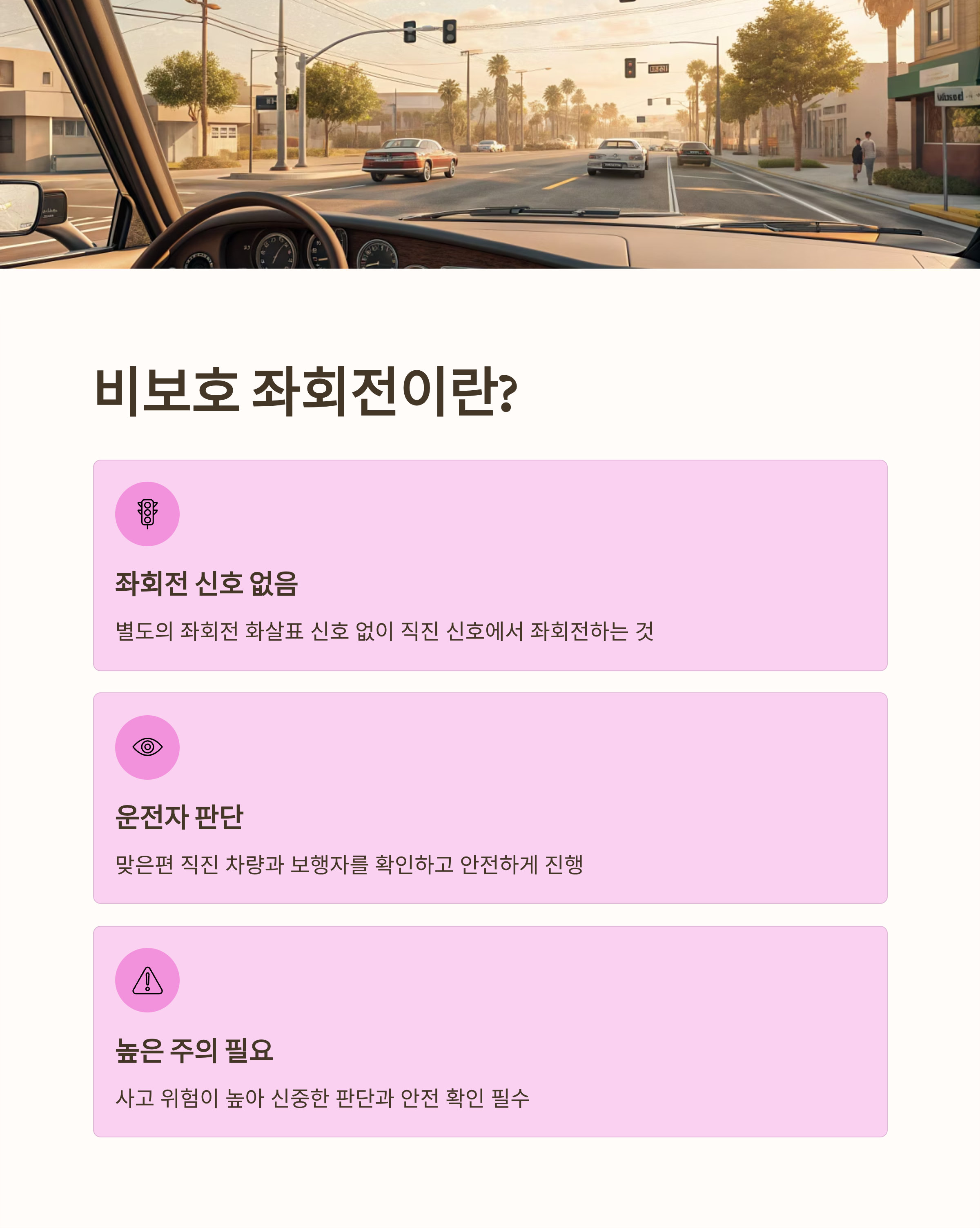 🔒 본 콘텐츠는 비보호 좌회전 사고에 대한 일반적인 정보를 제공하며, 특정 사고 상황에 대한 법률 자문이나 과실 비율 판단을 대체할 수 없습니다. 실제 사고 발생 시에는 반드시 보험사, 경찰, 법률 전문가와 상담하여 정확한 정보를 확인하고 적절한 조치를 취하시기 바랍니다. 모든 운전은 안전 수칙을 준수해야 합니다.