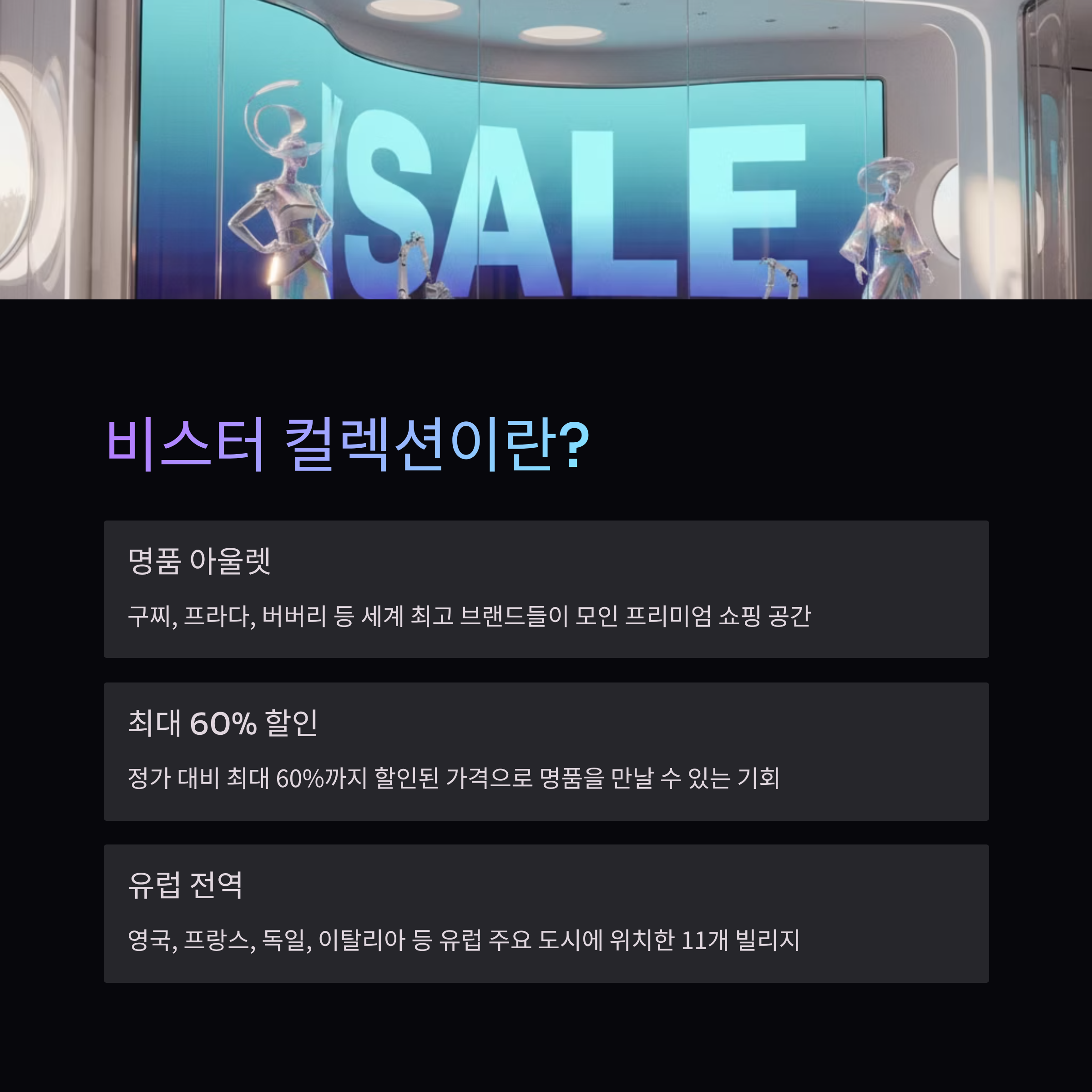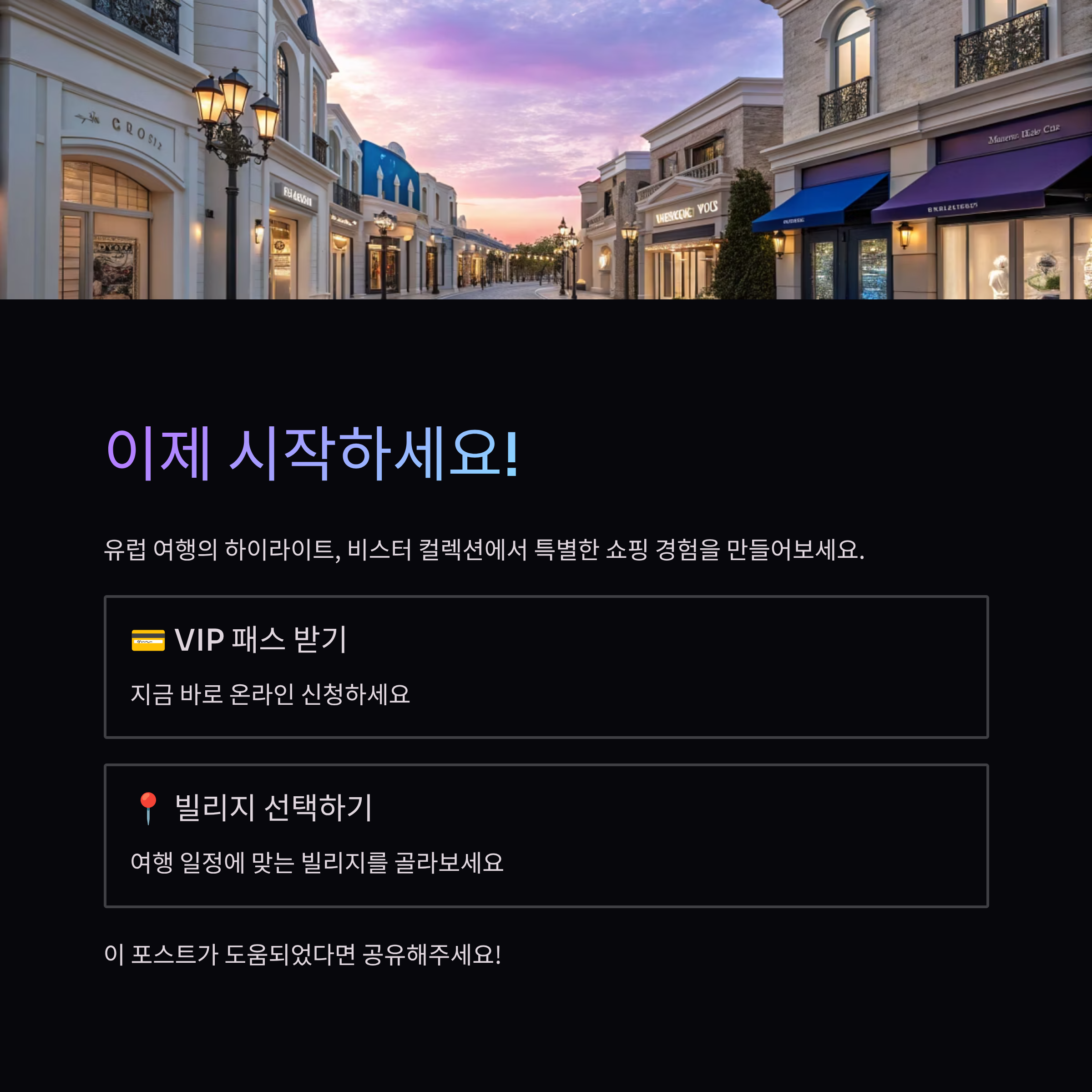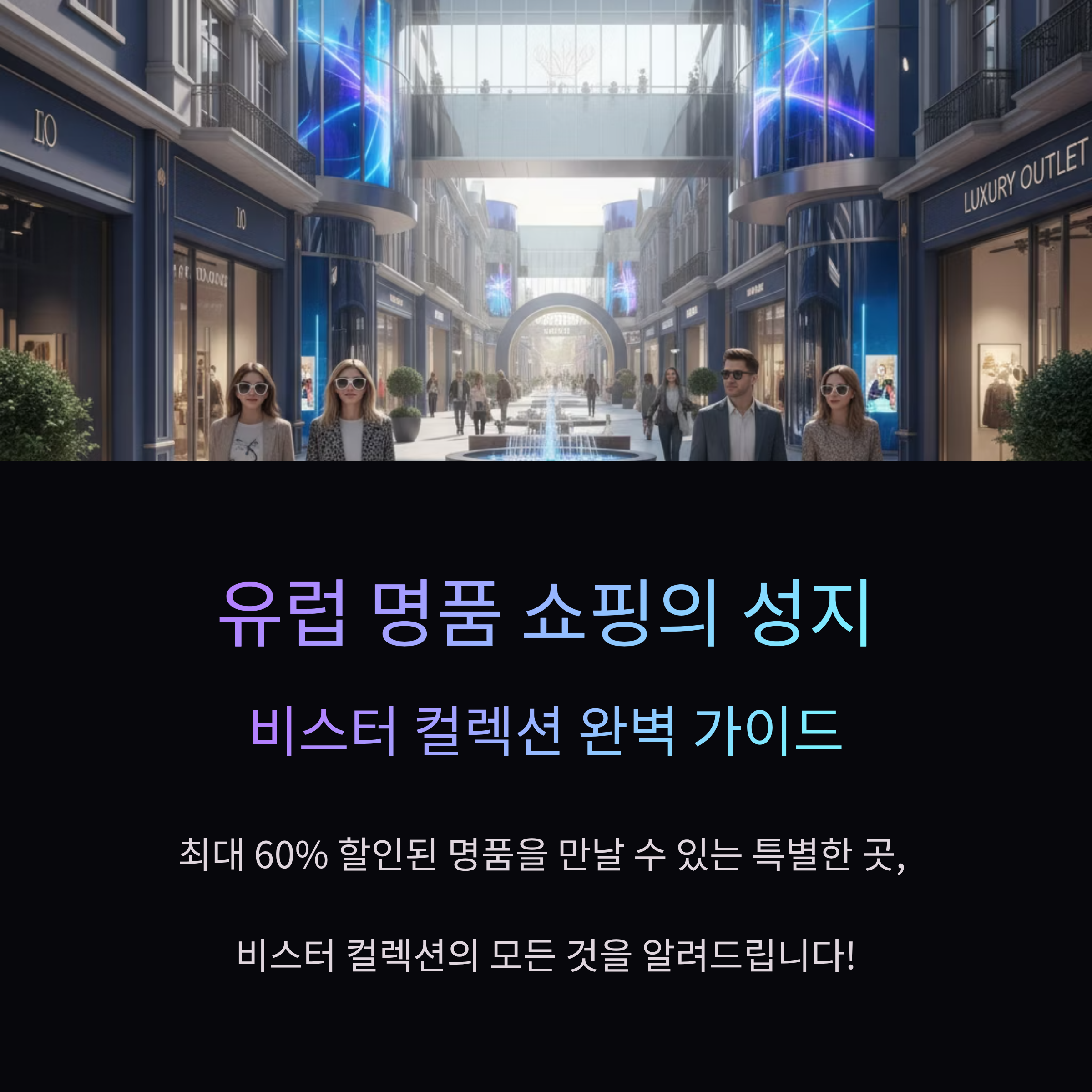 하지만 이왕 하는 쇼핑, 더 똑똑하고 알뜰하게 즐겨야겠죠? 이번 글에서는 비스터 컬렉션의 모든 것, 특히 아울렛 가격에서 추가 10% 할인을 받을 수 있는 마법의 'VIP 쿠폰'을 받는 방법부터, 쇼핑 동선, 택스리펀 꿀팁까지 A to Z를 완벽하게 알려드릴게요. 이 글 하나면 당신도 유럽 쇼핑의 고수가 될 수 있습니다! 🛍️