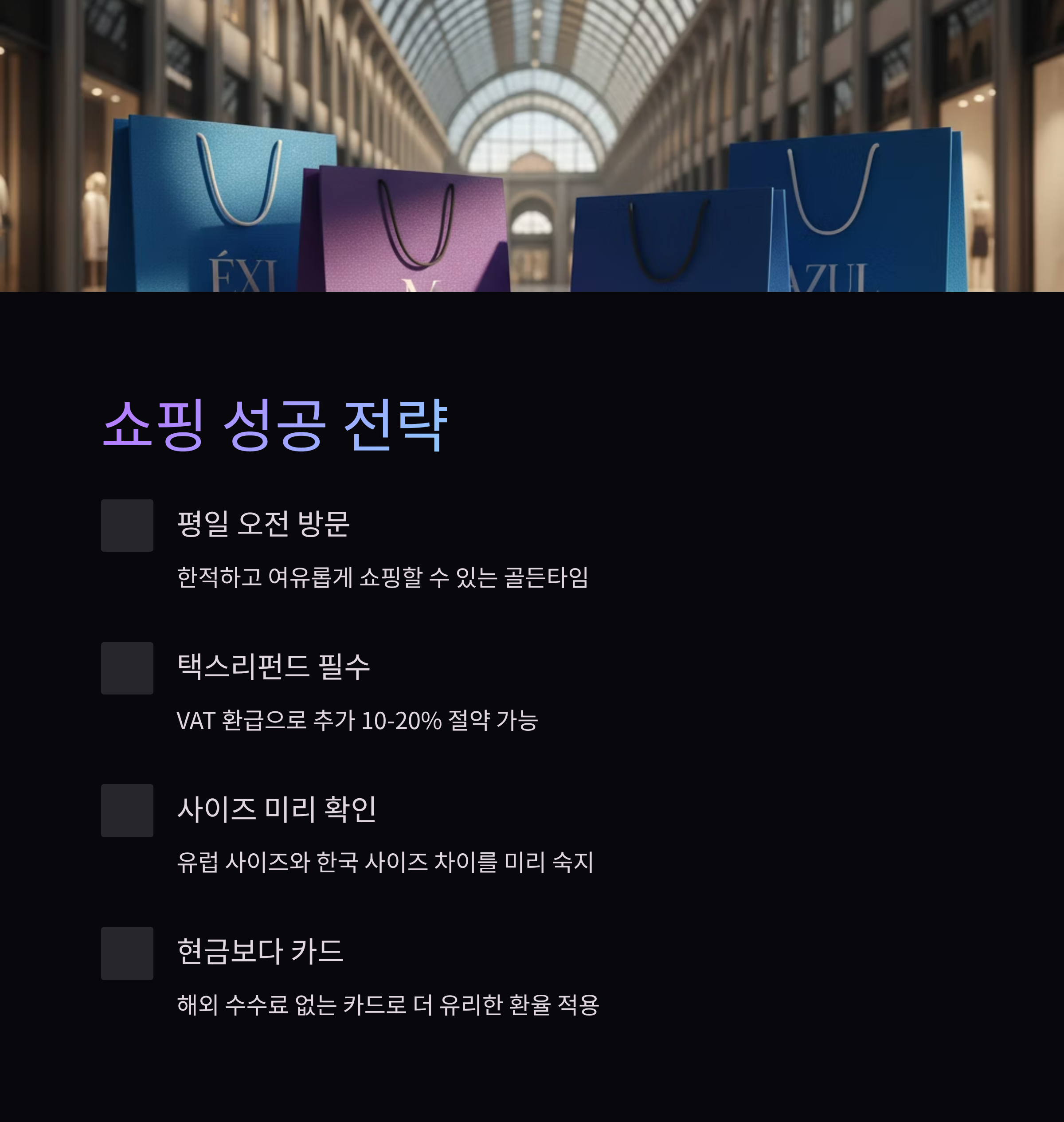 4. 할인 제외 브랜드 확인: VIP 패스는 프라다, 구찌 등 일부 인기 브랜드에서는 적용되지 않을 수 있습니다. 결제 전 직원에게 "VIP discount available?"이라고 물어보는 것이 좋습니다.