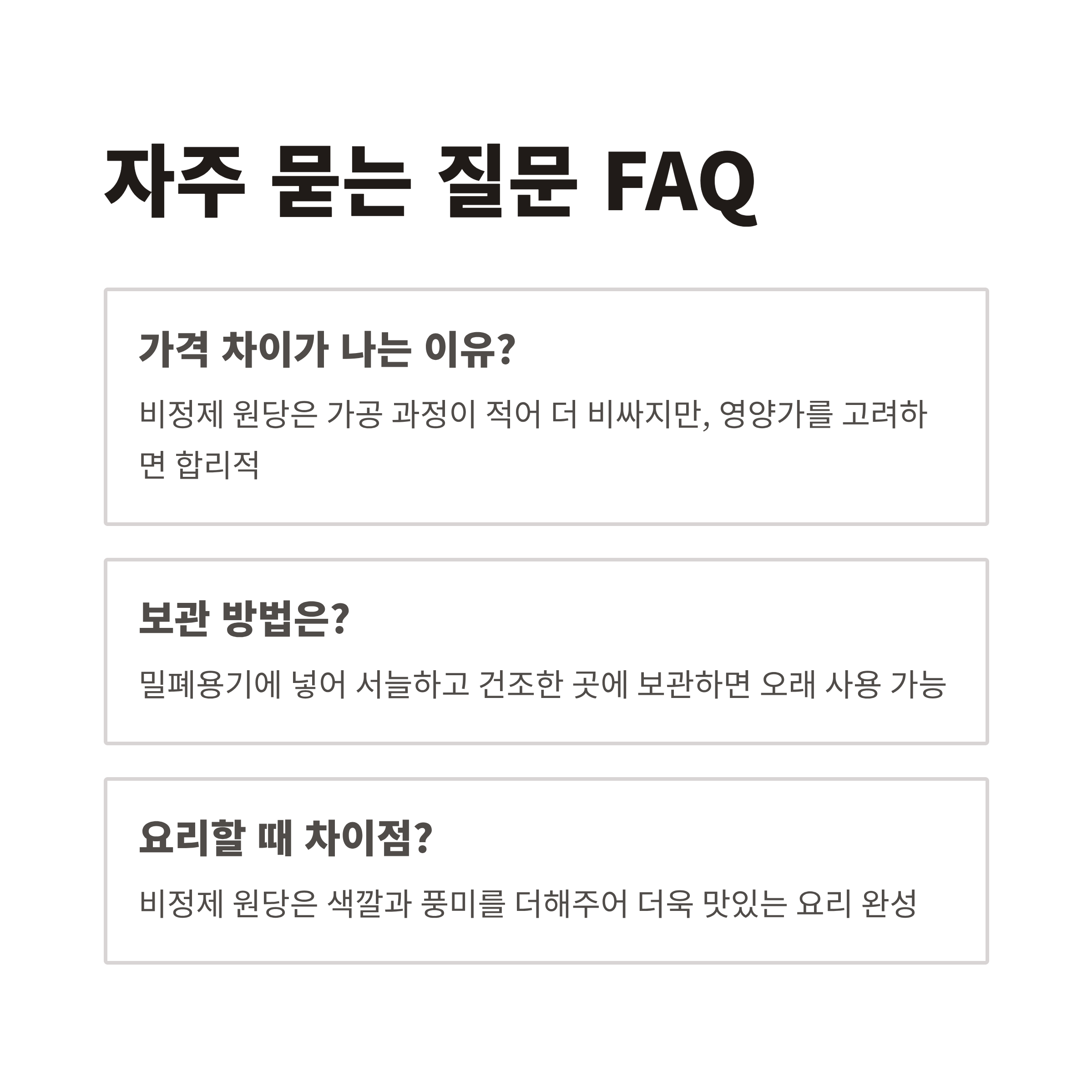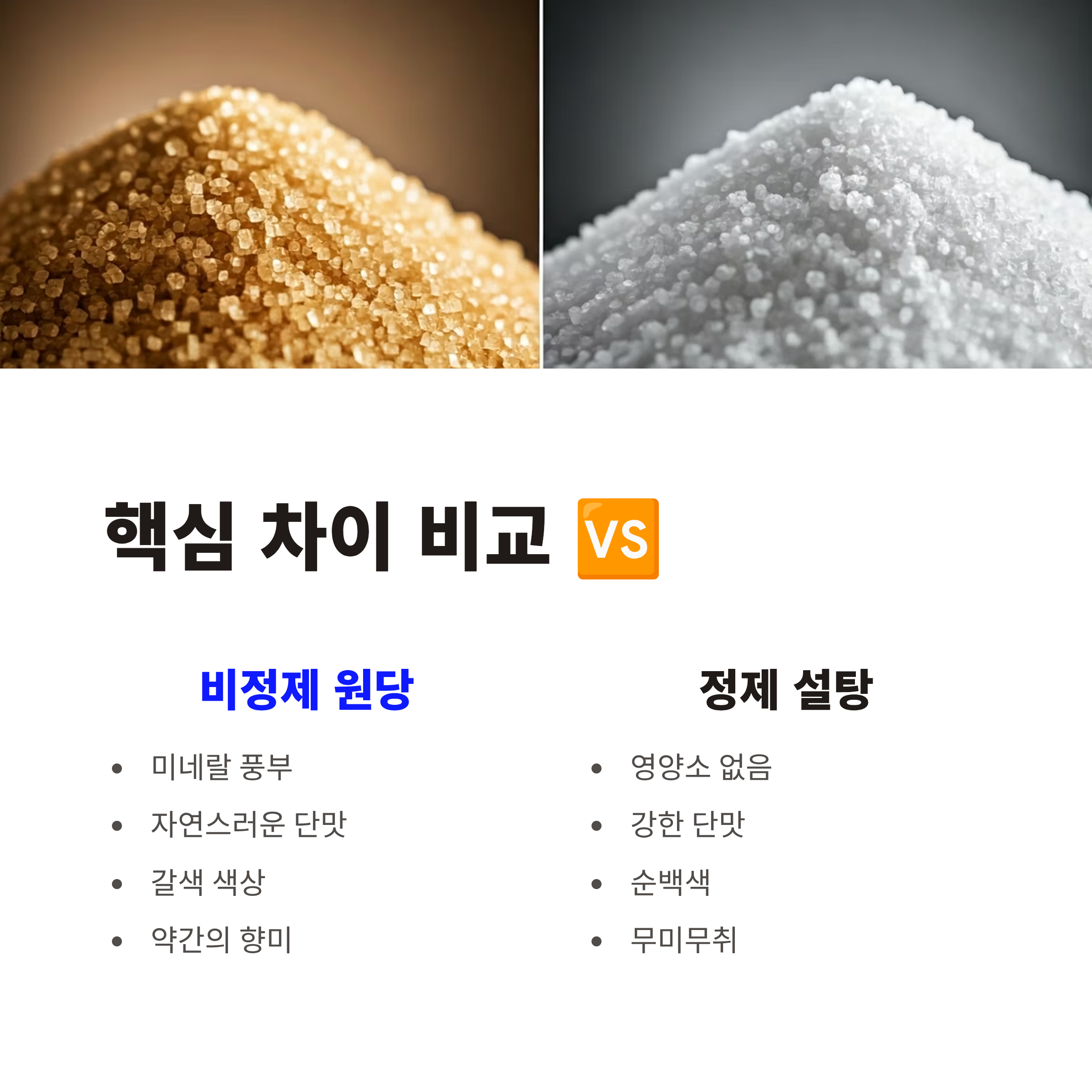 | 선택 기준 | 비정제 원당 | 정제 설탕 (백설탕) |