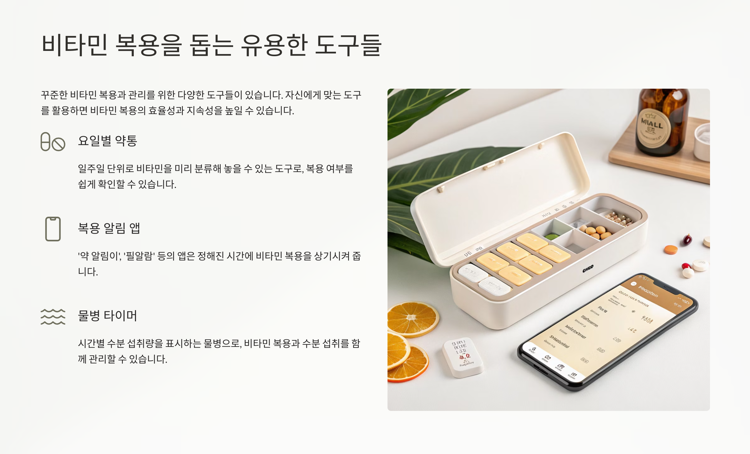 이제 다음 섹션에서는 비타민 복용을 더욱 스마트하고 편리하게 만들어 줄 유용한 도구와 앱들을 소개할게요! 📱
