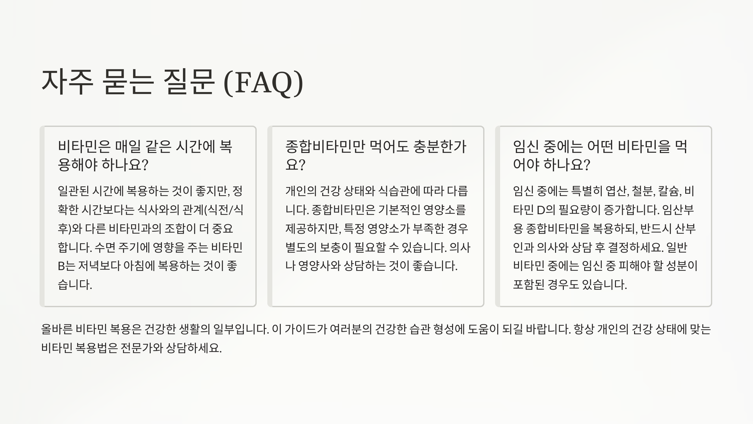 이 팁들을 잘 지킨다면, 비타민과 영양제가 여러분의 건강을 지키는 든든한 파트너가 될 수 있을 거예요. 현명하게 복용하고, 건강한 삶을 유지하세요! 💯