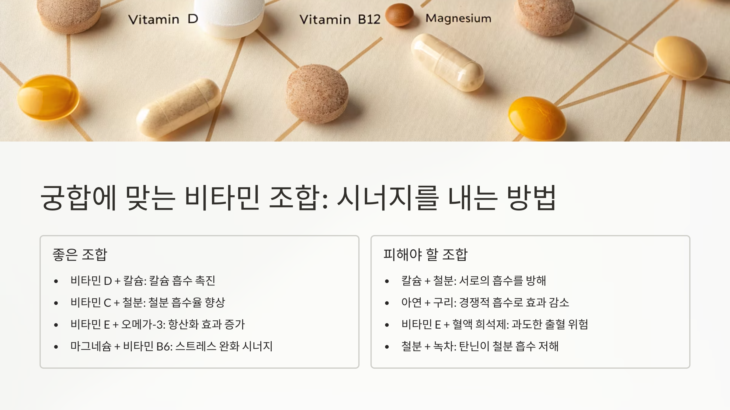 다음 섹션에서는 비타민과 영양소들을 함께 복용할 때 '궁합'을 어떻게 맞춰야 하는지 자세히 알아볼게요. 시너지 효과를 내고, 흡수를 방해하지 않는 조합을 찾아보세요! 🤝