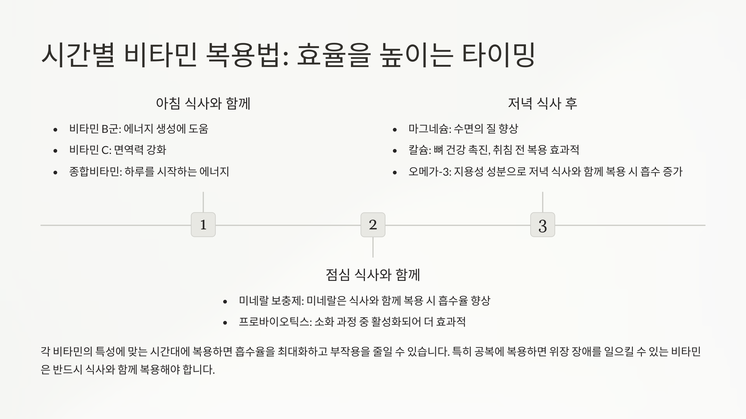 다음으로는 각 비타민과 영양소들을 언제 먹는 것이 가장 효과적인지 '시간별 복용법'에 대해 자세히 알아볼게요. 여러분의 영양제 복용 루틴을 업그레이드할 시간이에요! ⏰