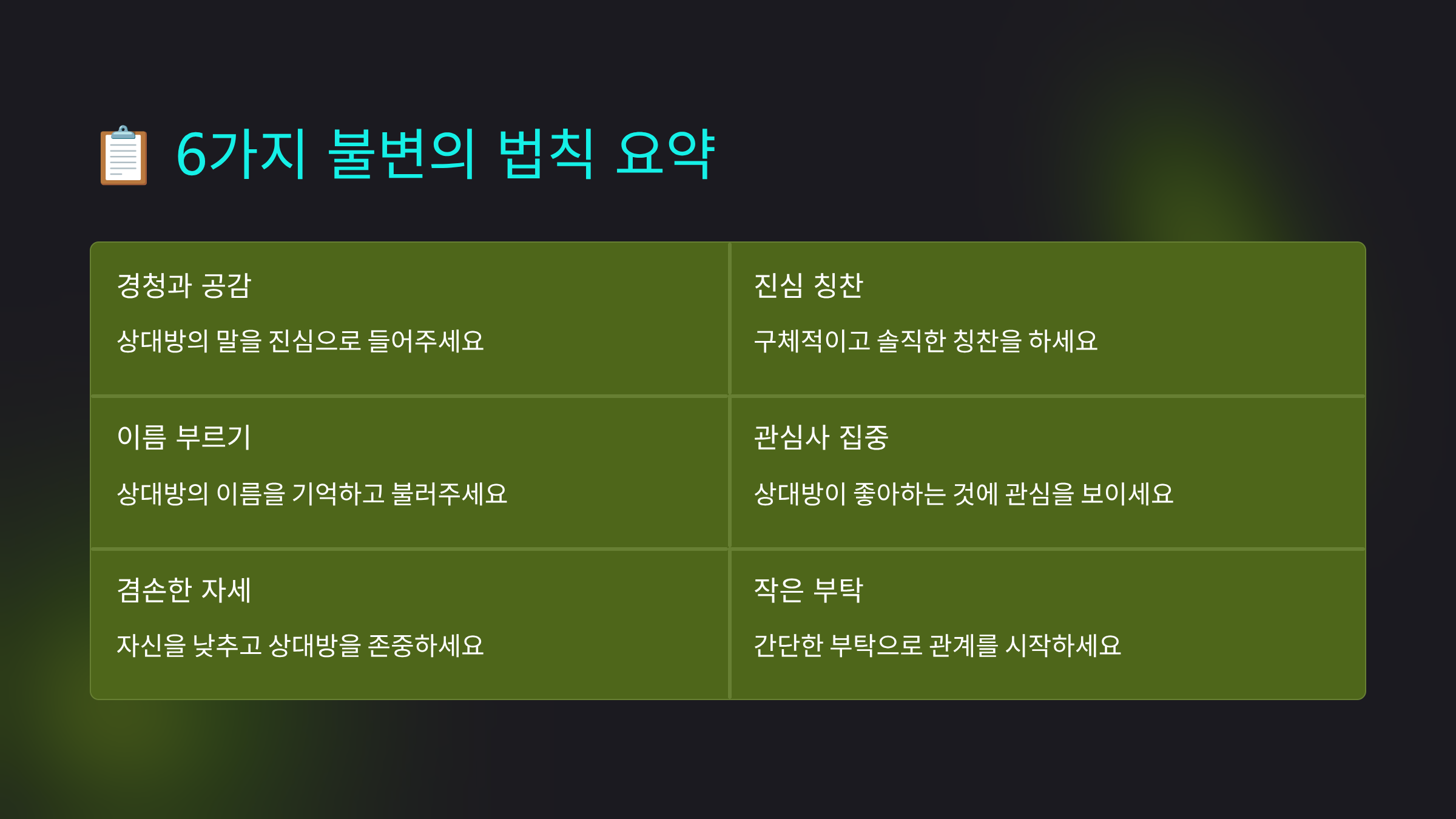 | 1. 경청과 공감 | 상대방의 이야기에 귀 기울이고 감정 이해 | 깊은 신뢰 및 유대감 형성 |