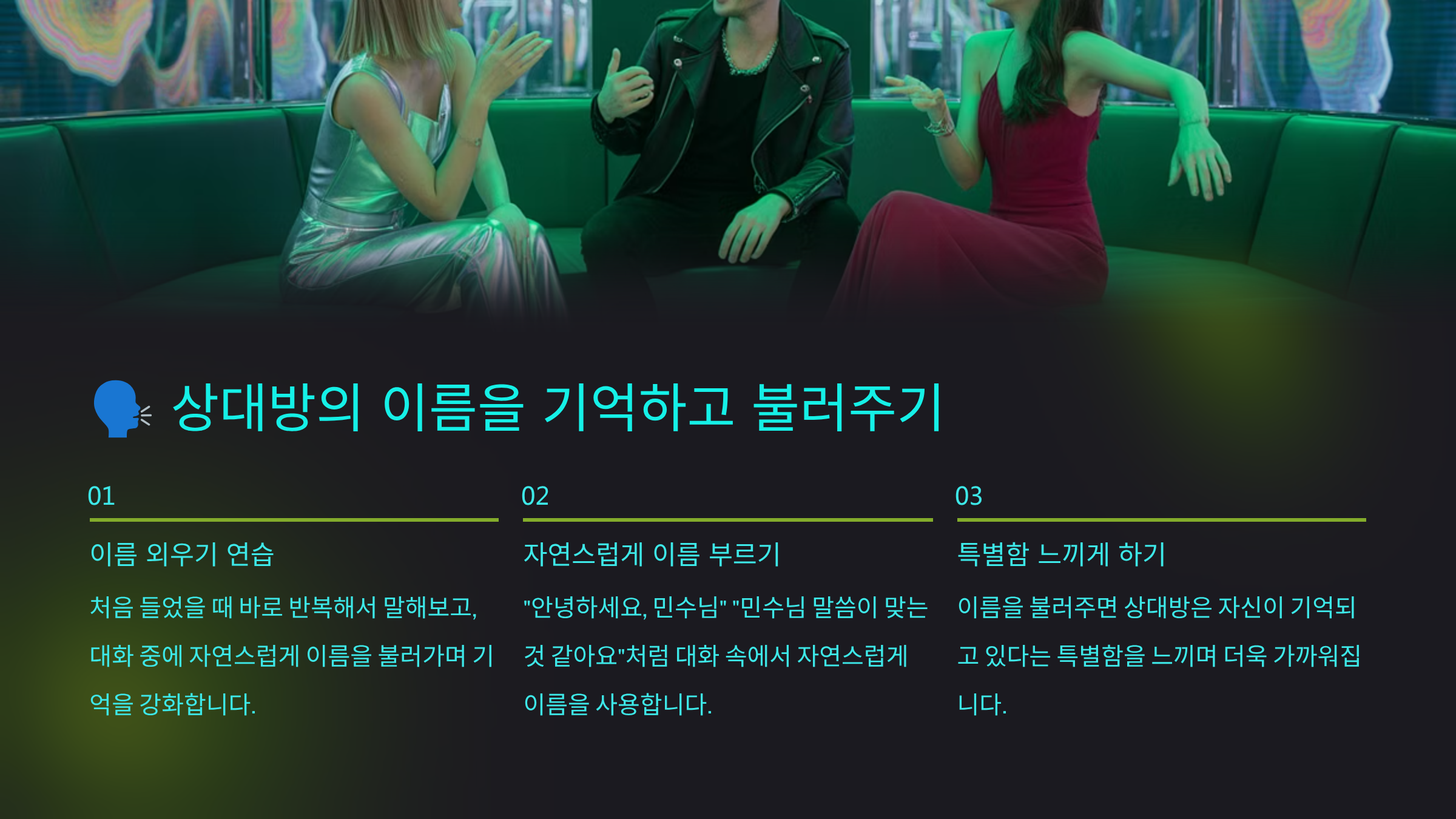 | 3. 이름 기억 및 호칭 | 상대방의 이름을 기억하고 대화 시 사용 | 친밀감 및 존중감 표현 |