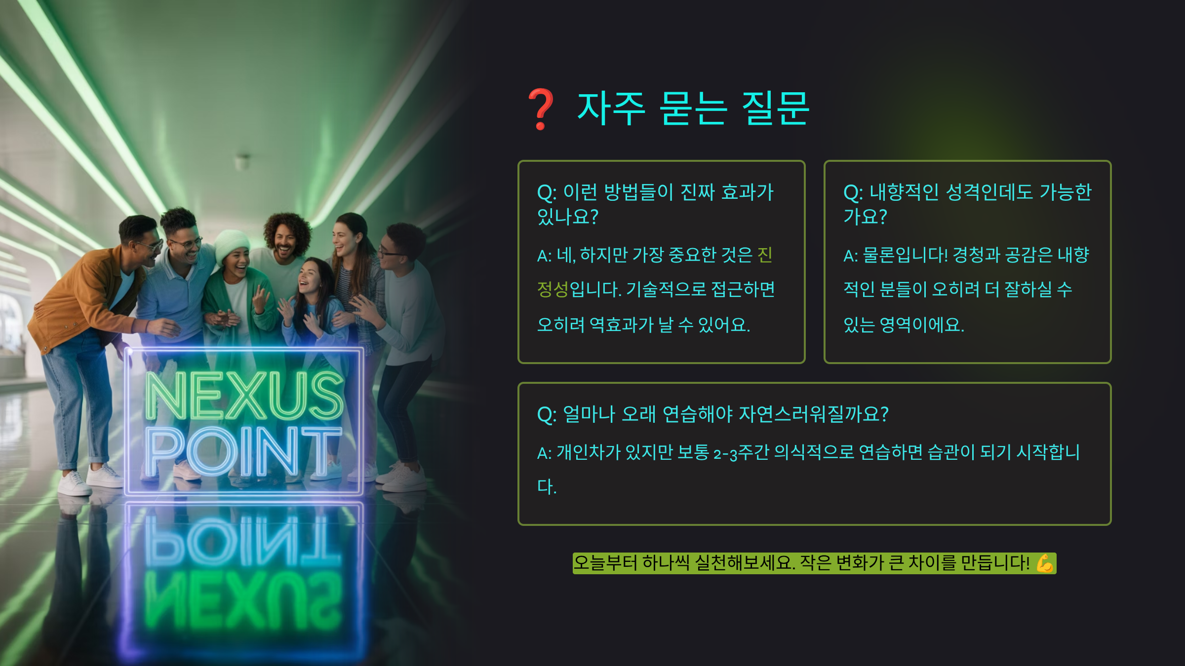 A6. 처음에는 어색하거나 인위적으로 느껴질 수 있지만, 이 법칙들은 결국 타인을 진심으로 존중하고 배려하는 마음에서 우러나와야 합니다. 꾸준히 연습하고 진심을 담으려 노력하면 자연스러워집니다. 핵심은 '기술'이 아니라 '태도'라는 것을 기억하세요.