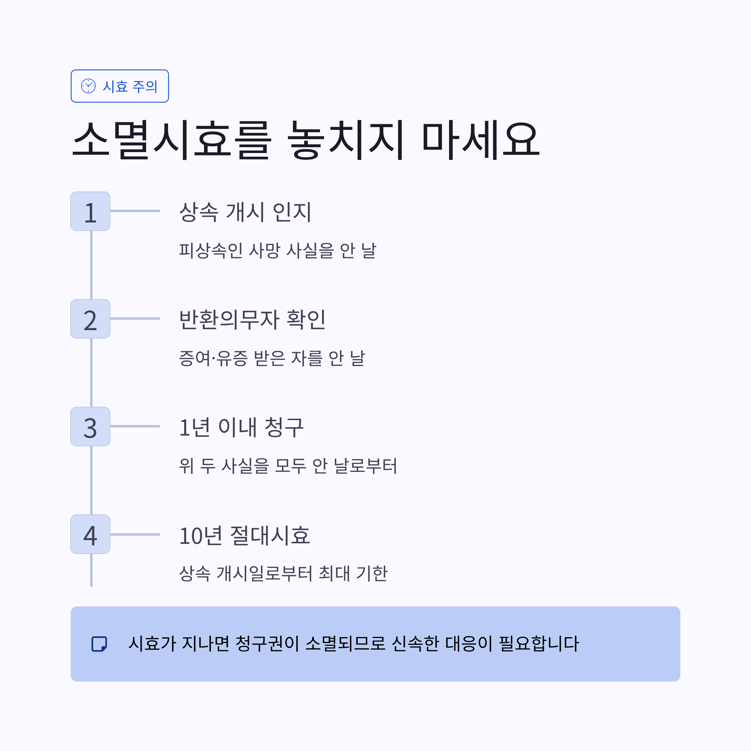 가장 중요한 것은 소멸시효(상속 개시와 반환 사실을 안 날로부터 1년, 상속 개시일로부터 10년)를 놓치지 않는 것입니다.
