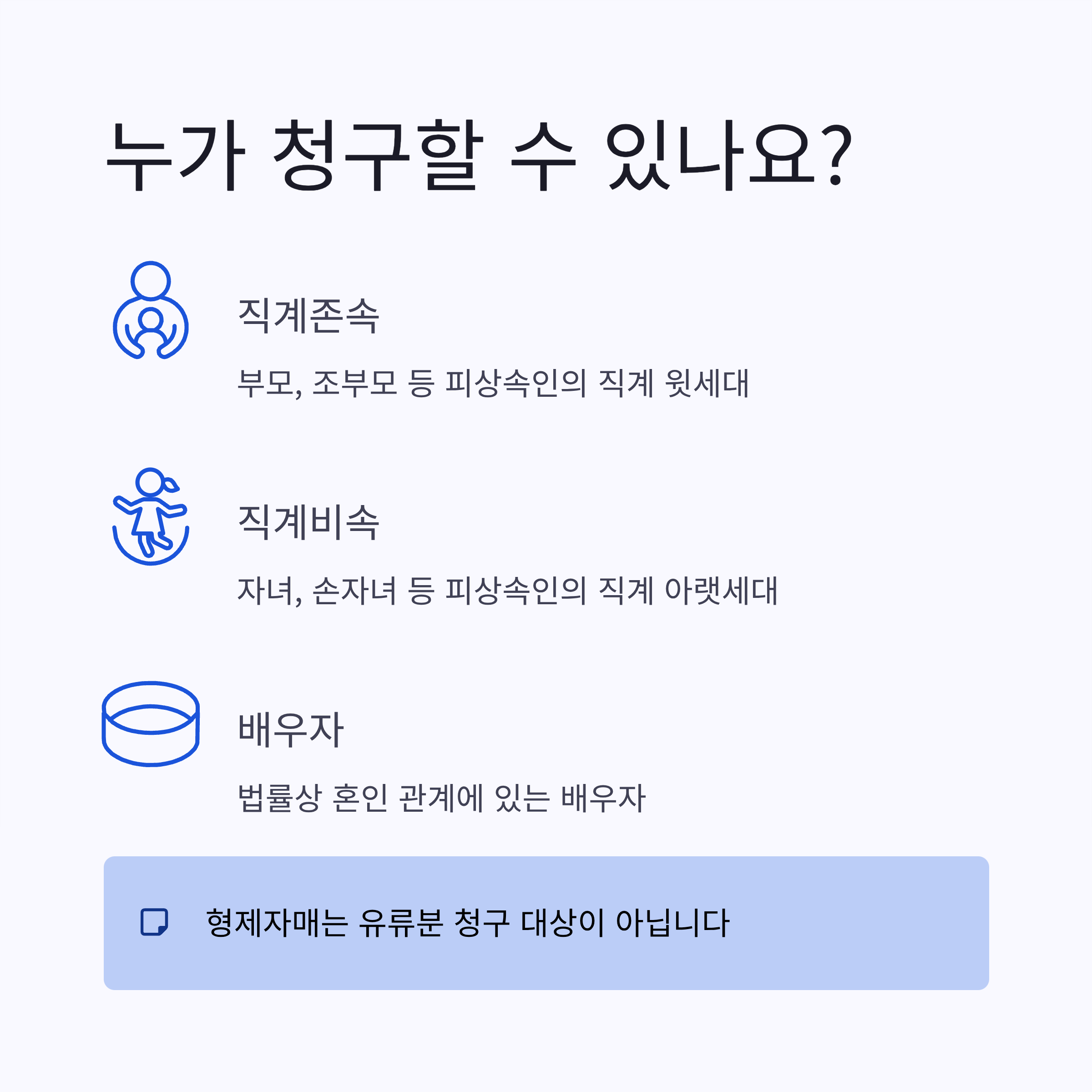 유류분 청구 소송은 모든 상속인이 제기할 수 있는 것은 아니며, 민법에서 정한 유류분권자(청구 권리자)만 신청할 수 있습니다. 유류분권자는 다음과 같습니다.