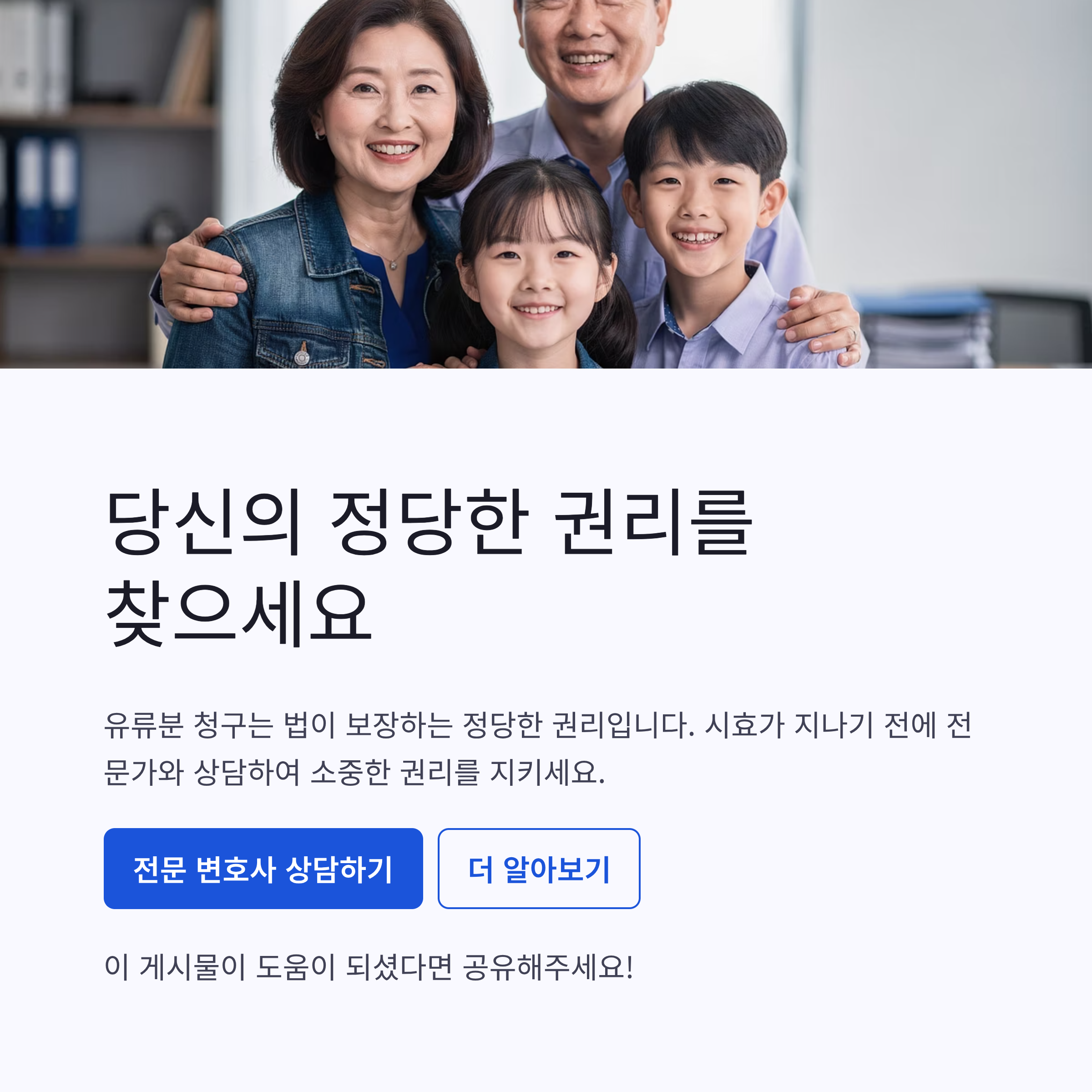 - 해결 약속: 유류분 제도의 핵심 개념부터 신청 자격, 금액 계산, 소송 절차, 그리고 소멸시효 등 모든 것을 명확하게 설명하여 당신의 정당한 상속 권리를 되찾는 데 필요한 구체적인 가이드를 제공합니다.