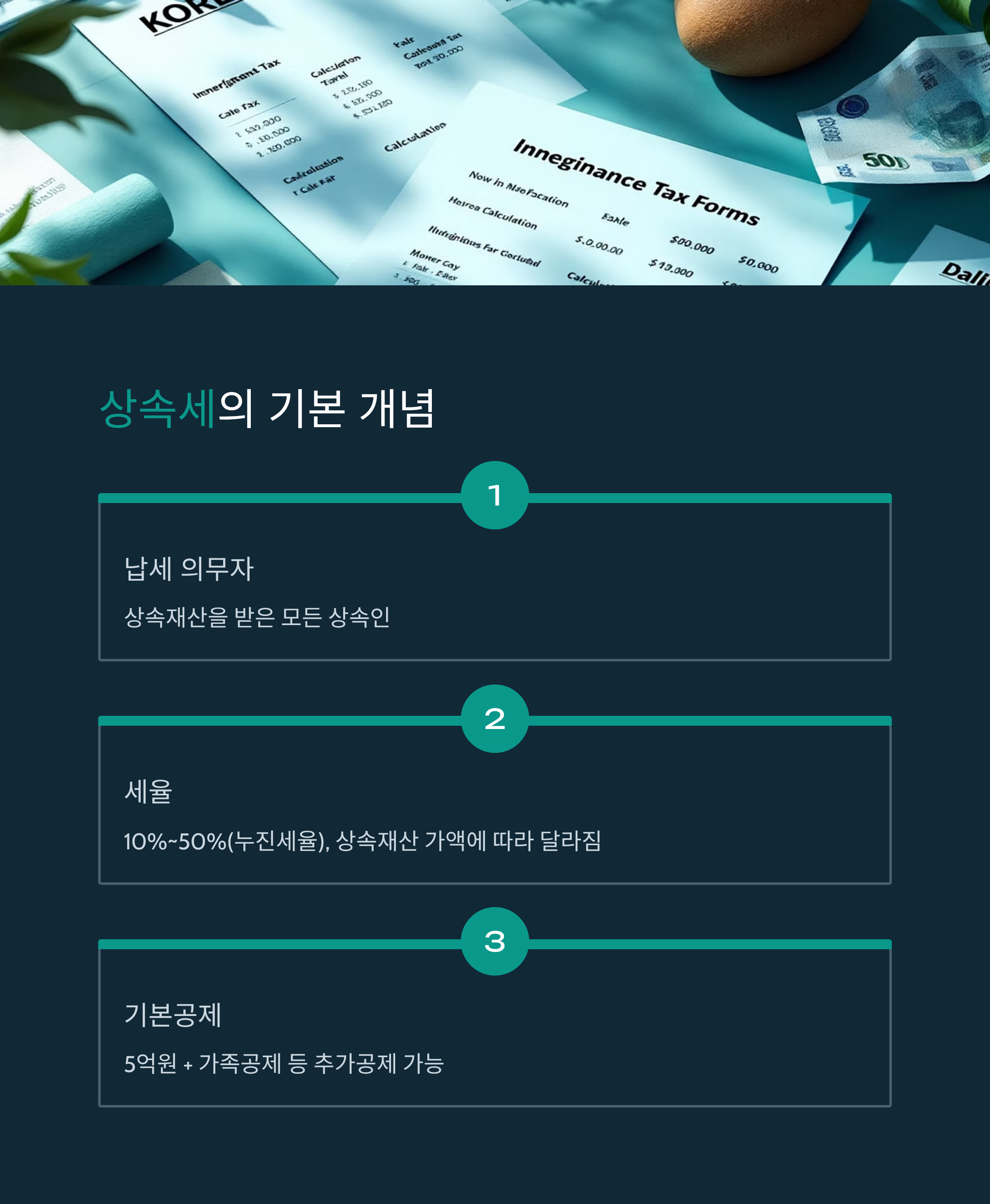 | 주요 공제 | 일괄 공제 (5억), 배우자 공제, 금융재산 공제 등 |