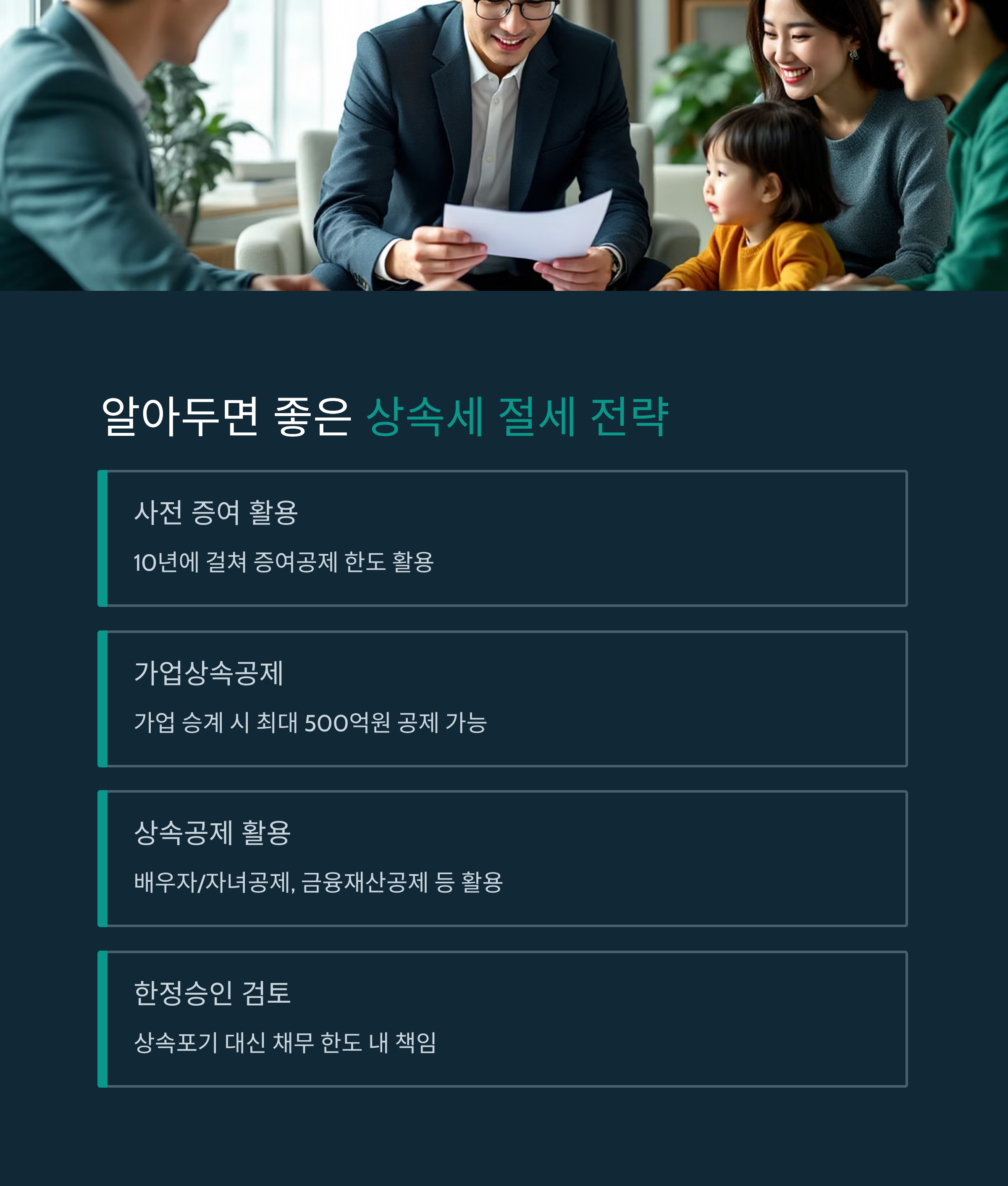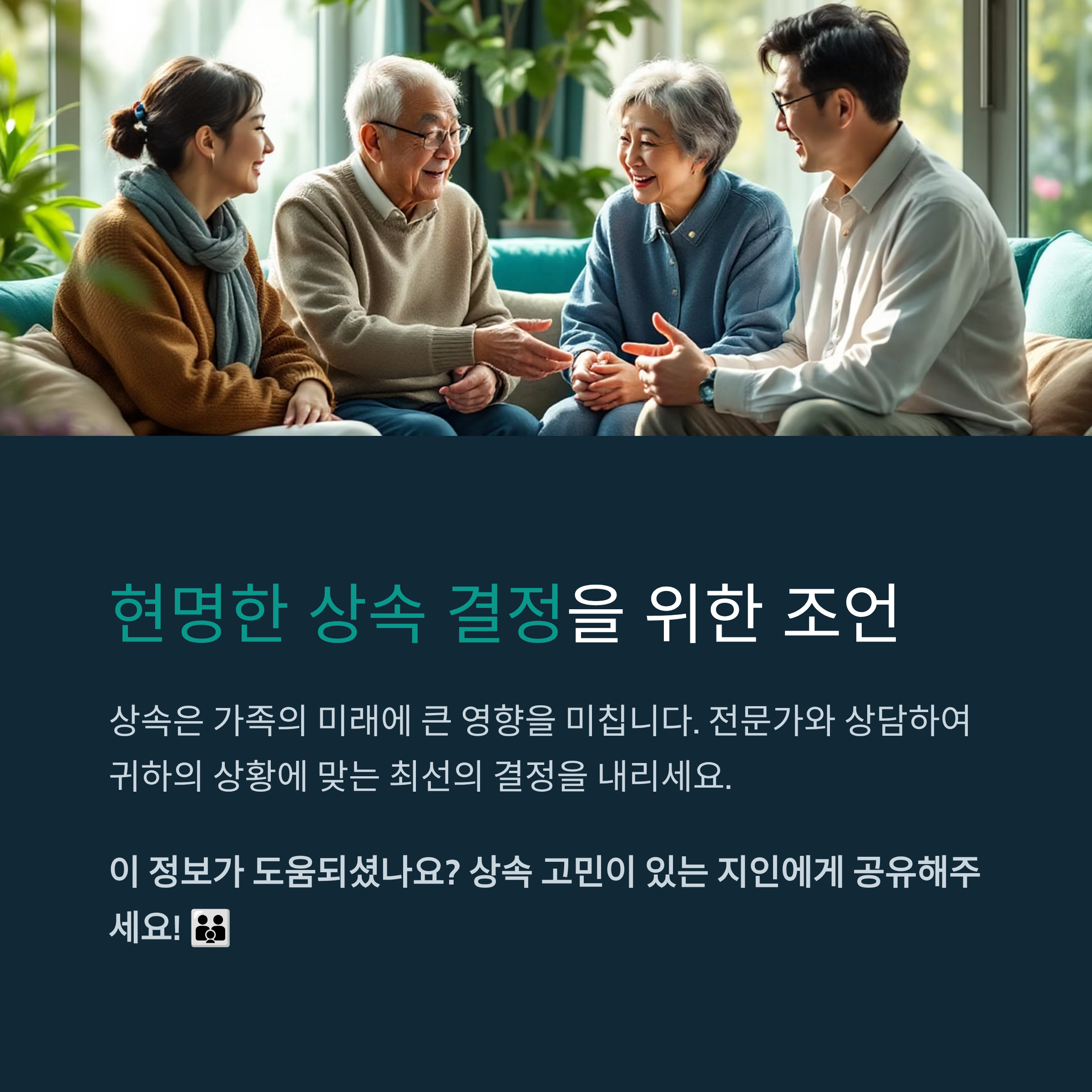 - 상속세는 복잡하고 개별적인 상황에 따라 절세 전략이 크게 달라질 수 있습니다. 세무사, 변호사 등 전문가와 상담하여 정확한 상속 재산 평가와 최적의 절세 방안을 모색하는 것이 가장 중요합니다.