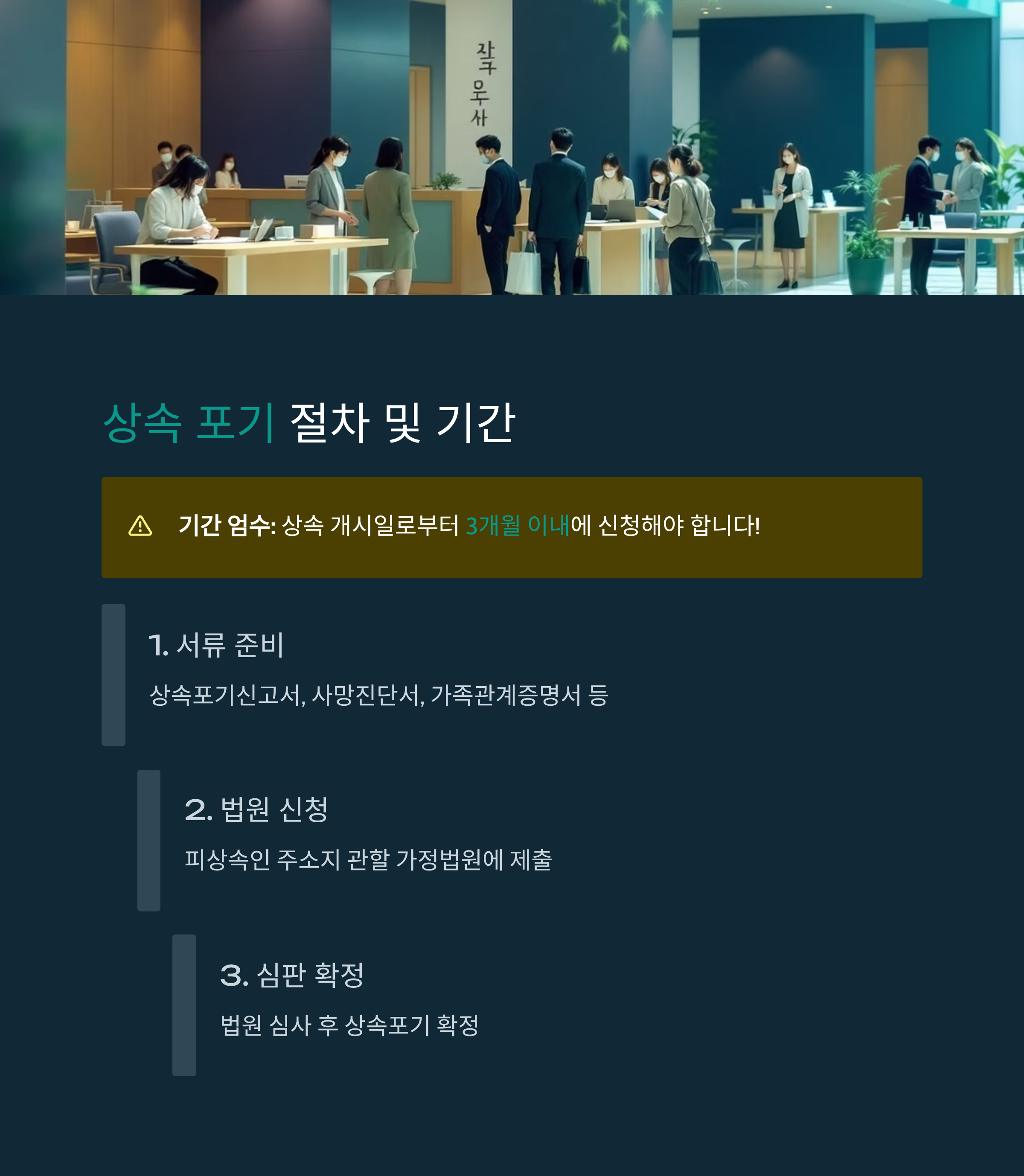 상속 포기는 고인의 사망(상속 개시)을 안 날로부터 3개월 이내에 가정법원에 신고해야 하는 중요한 절차입니다. 이 기간을 놓치면 '단순 승인'한 것으로 간주되어 고인의 채무까지 모두 상속받게 될 수 있으니 주의해야 합니다.