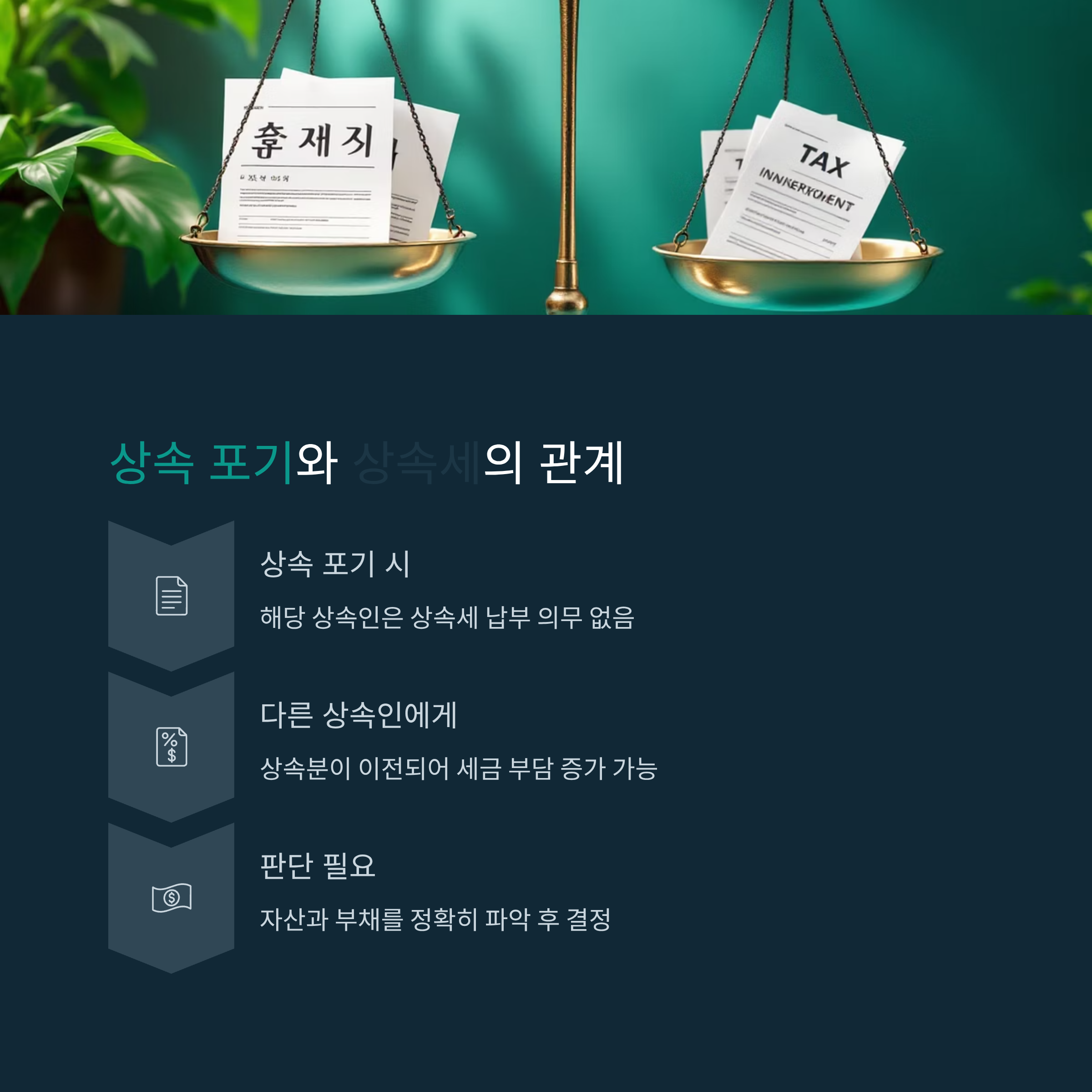 | 전체 상속세액 | 고인의 유산 전체 기준으로 부과 | 포기만으로 자동 절세되는 것 아님. 경우에 따라 오히려 증가 가능성. |