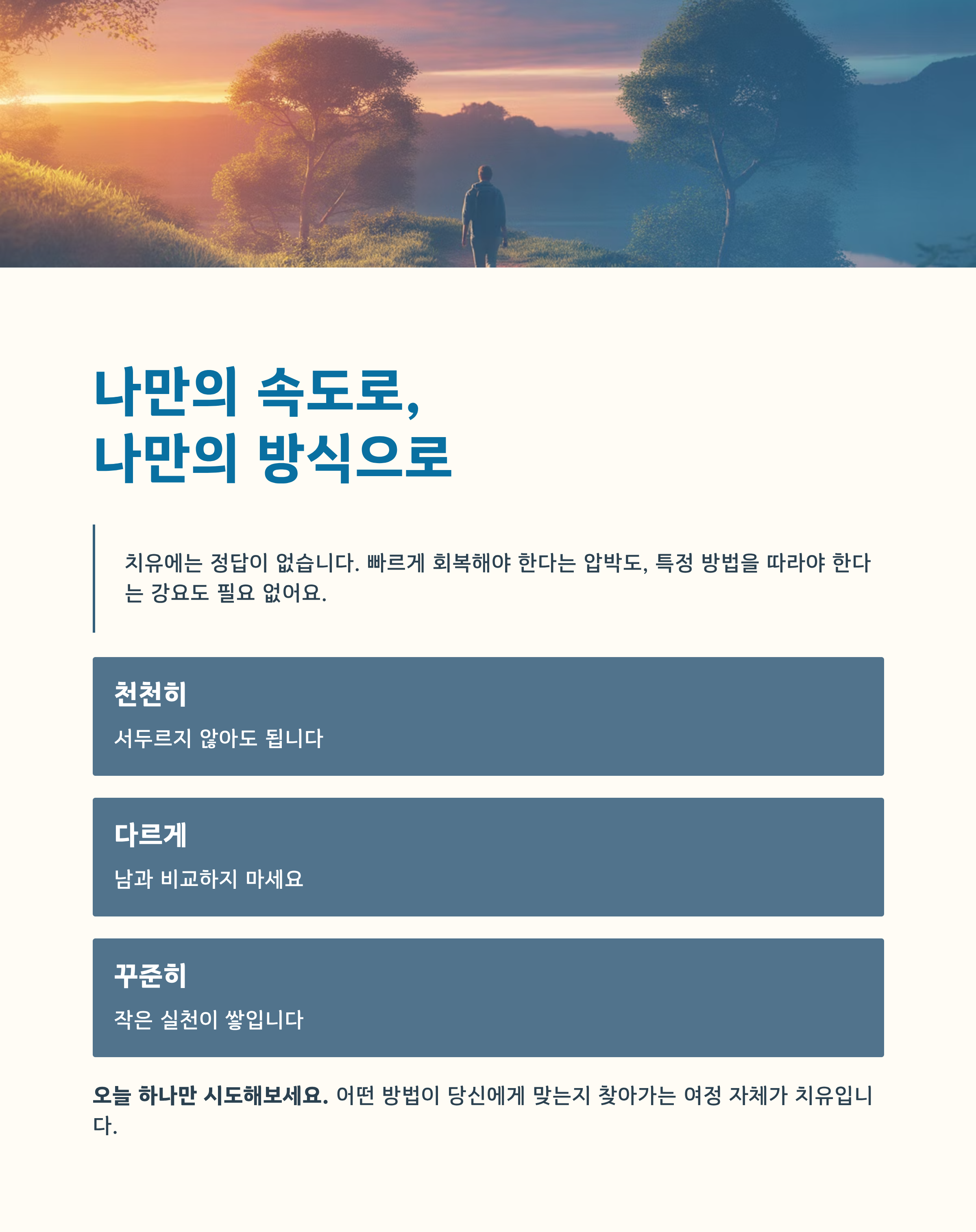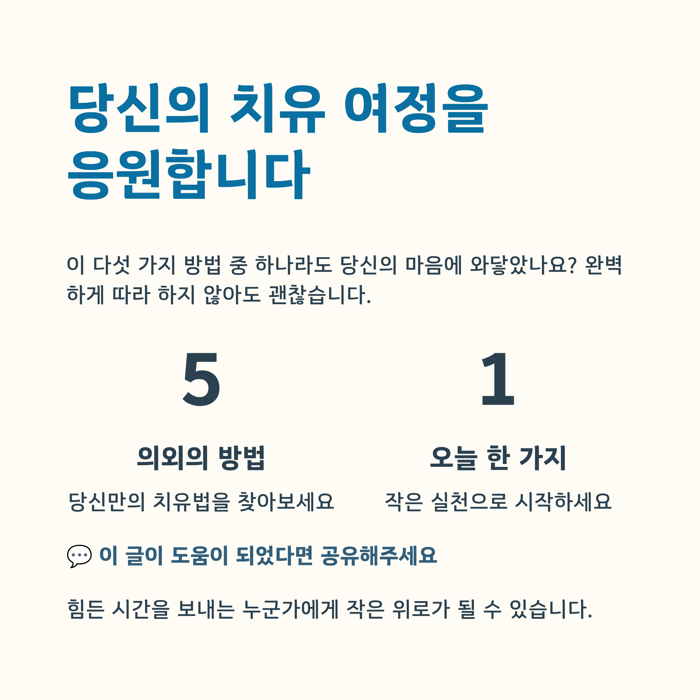 이 방법들을 모두 다 할 필요는 없습니다. 지금 가장 마음이 끌리는 것 하나부터, 아주 작게 시작해보세요. 나만의 속도로, 나만의 방식으로 스스로를 부드럽게 안아주는 시간을 가질 때, 당신의 상처는 어느새 조금씩 아물어 가고 있을 것입니다. 괜찮지 않아도 괜찮습니다. 그 마음 그대로, 당신의 치유 여정을 응원합니다.