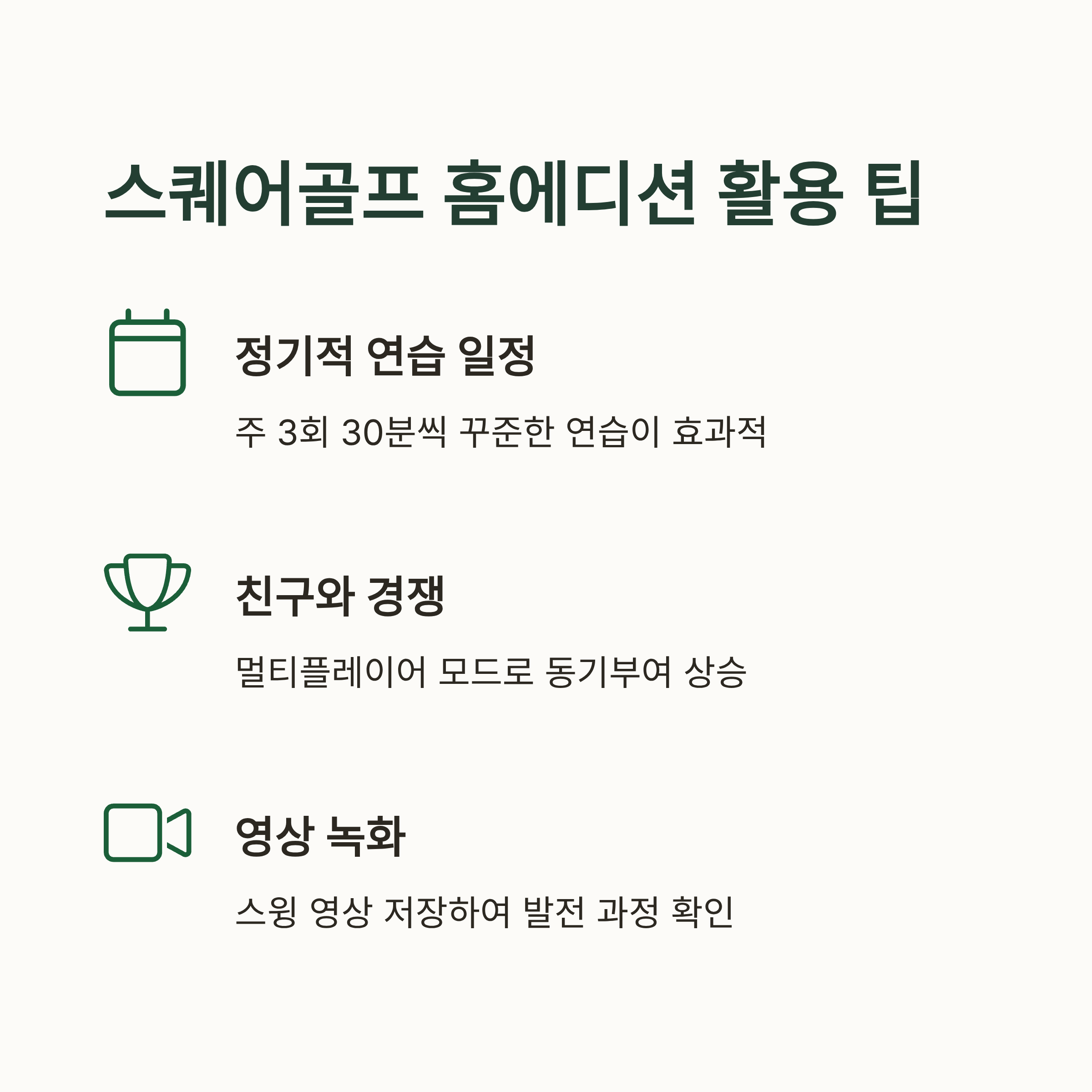 다음 섹션에서는 스퀘어골프 홈에디션의 '활용 팁'을 알려드릴게요. 당신의 골프 실력을 더욱 효과적으로 업그레이드해 보세요! 🎯