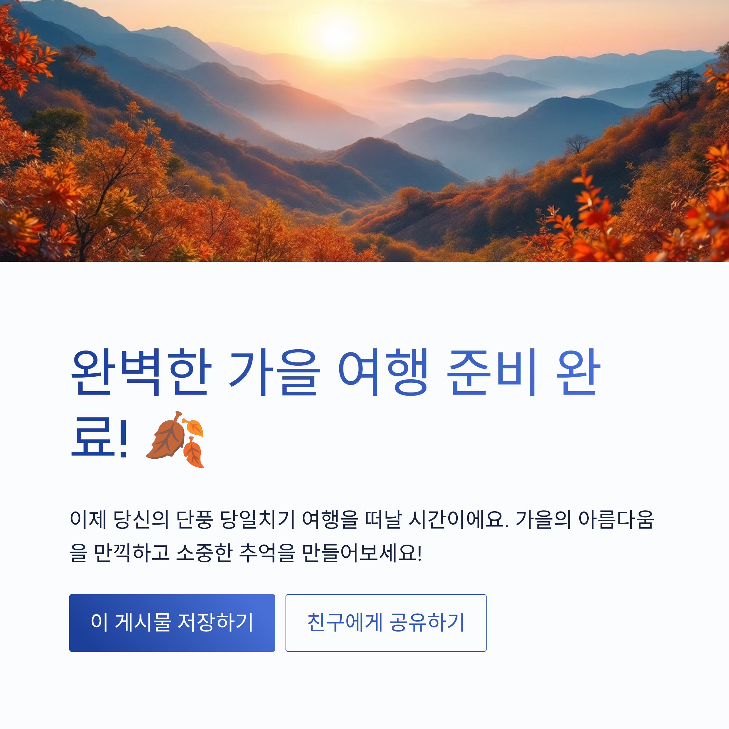 - 시간 절약: 숙박 없이 짧은 시간 안에 핵심 명소를 방문하여 가을 정취를 만끽할 수 있습니다.