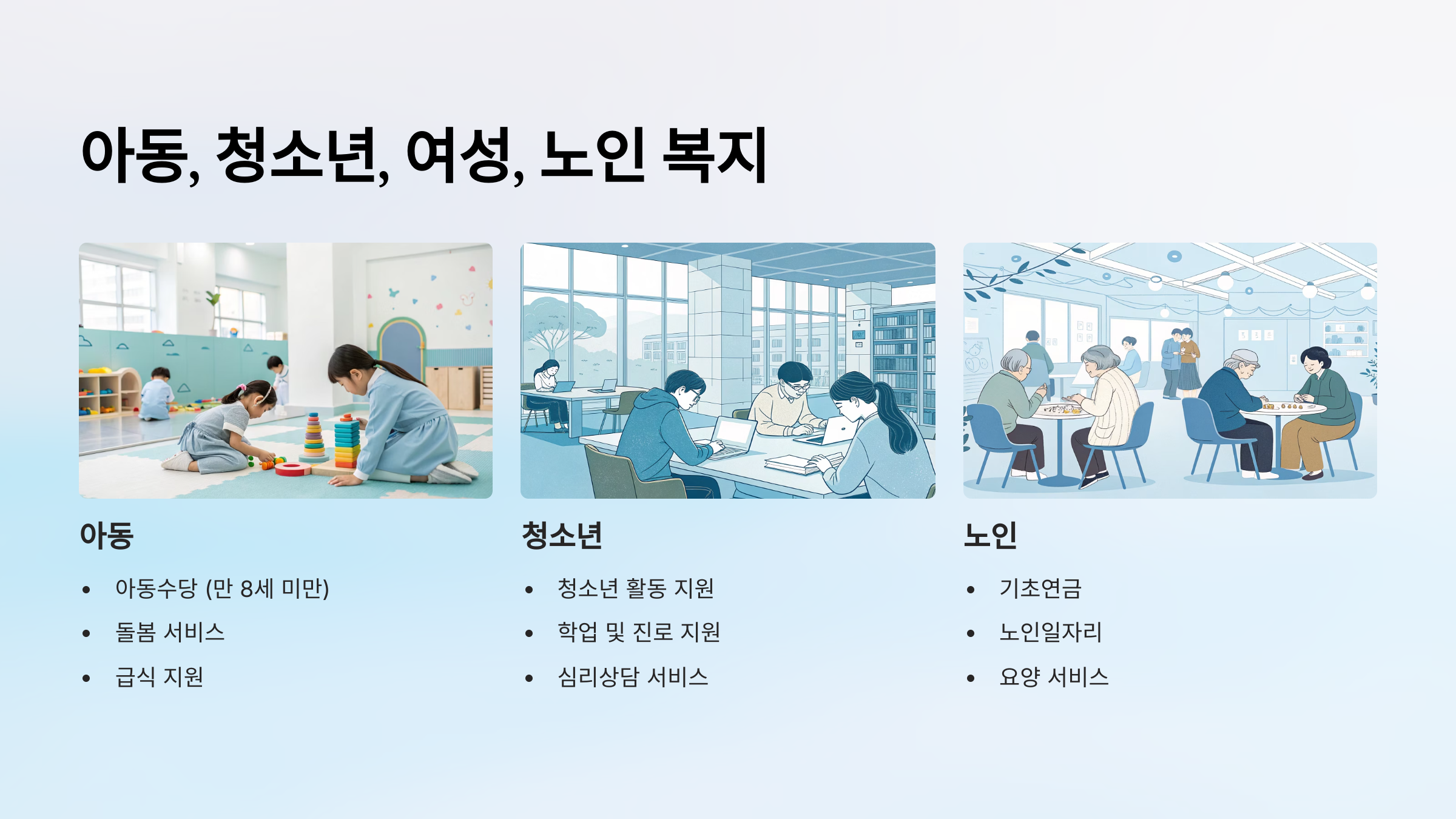 아동, 청소년, 여성, 노인 복지 👨👩👧👦