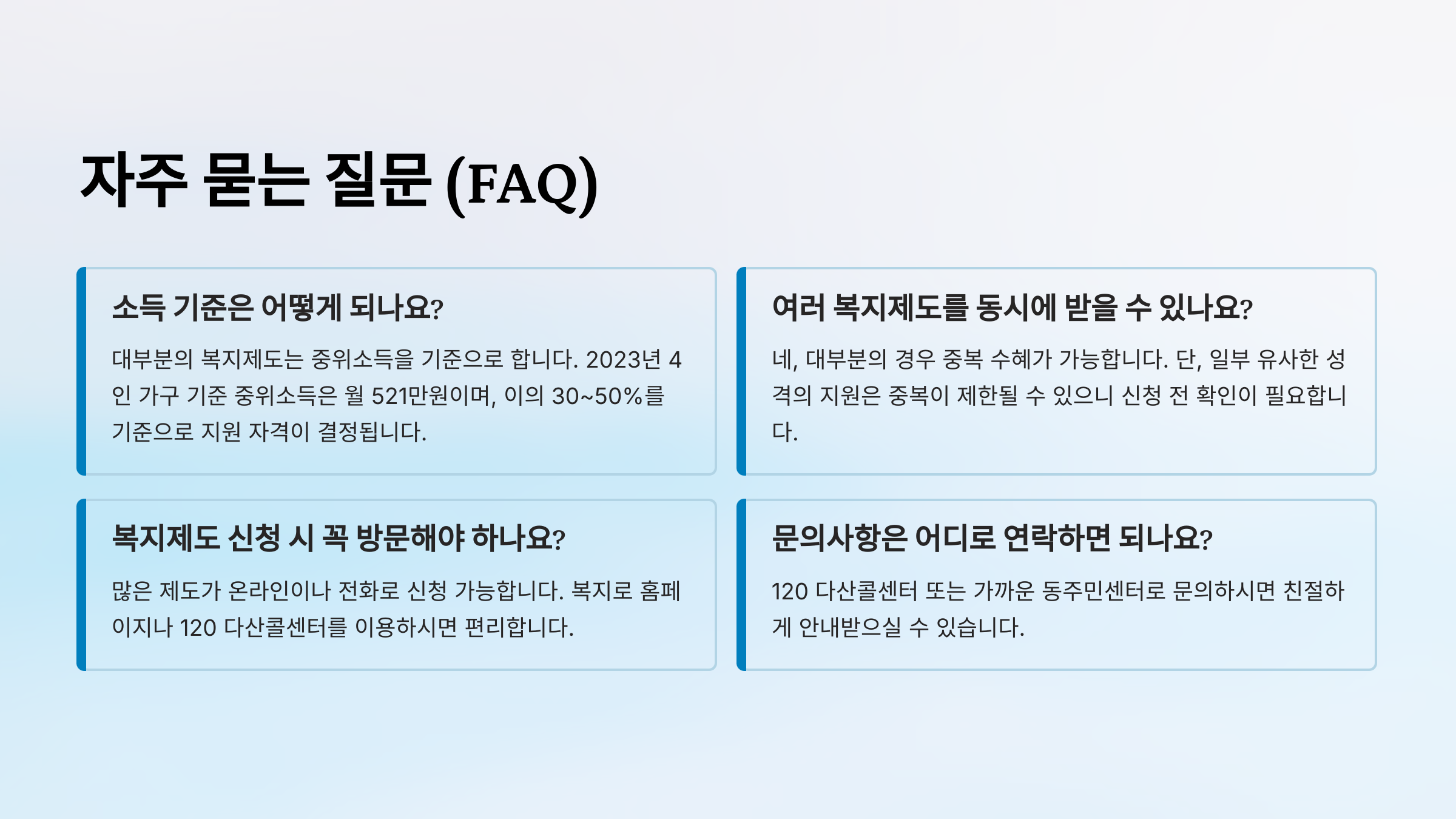 A5. 신청 후 심사 과정이 필요하며, 소득/재산 조사 및 경우에 따라서는 현장 방문 조사도 진행될 수 있습니다. 심사 기간은 제도마다 다르므로 담당자에게 문의하는 것이 정확합니다.