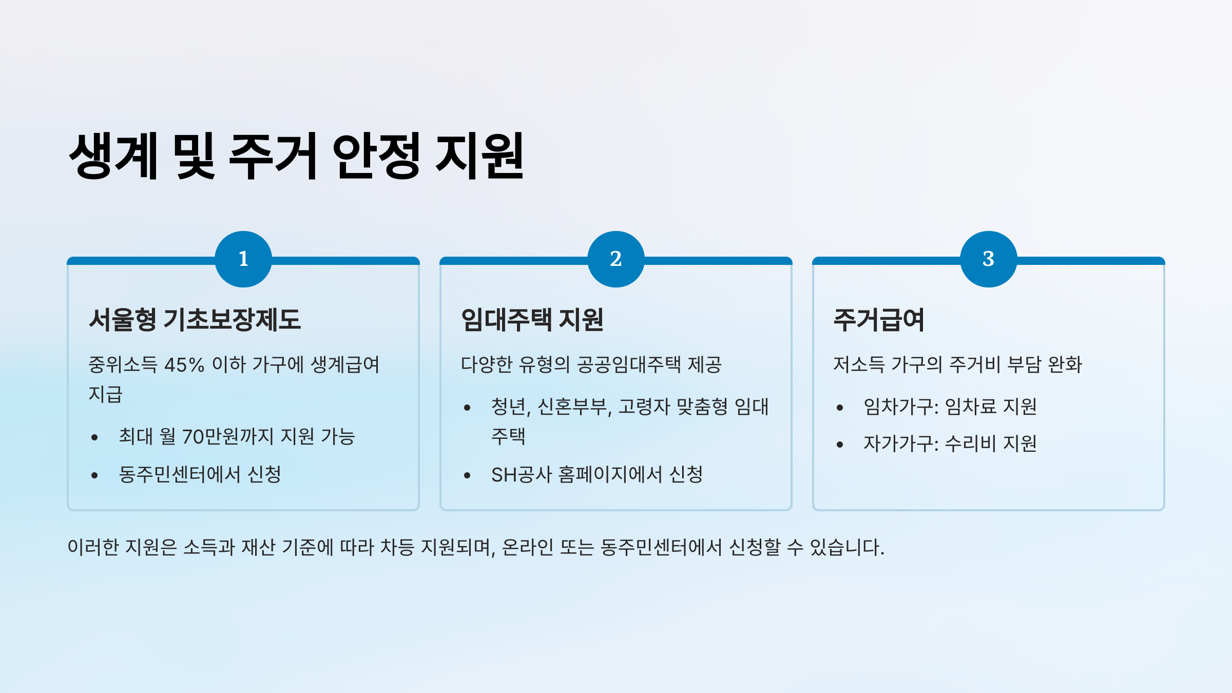 | 신청 | 구비 서류 제출 | 온라인 (복지로), 방문 (동주민센터) |
