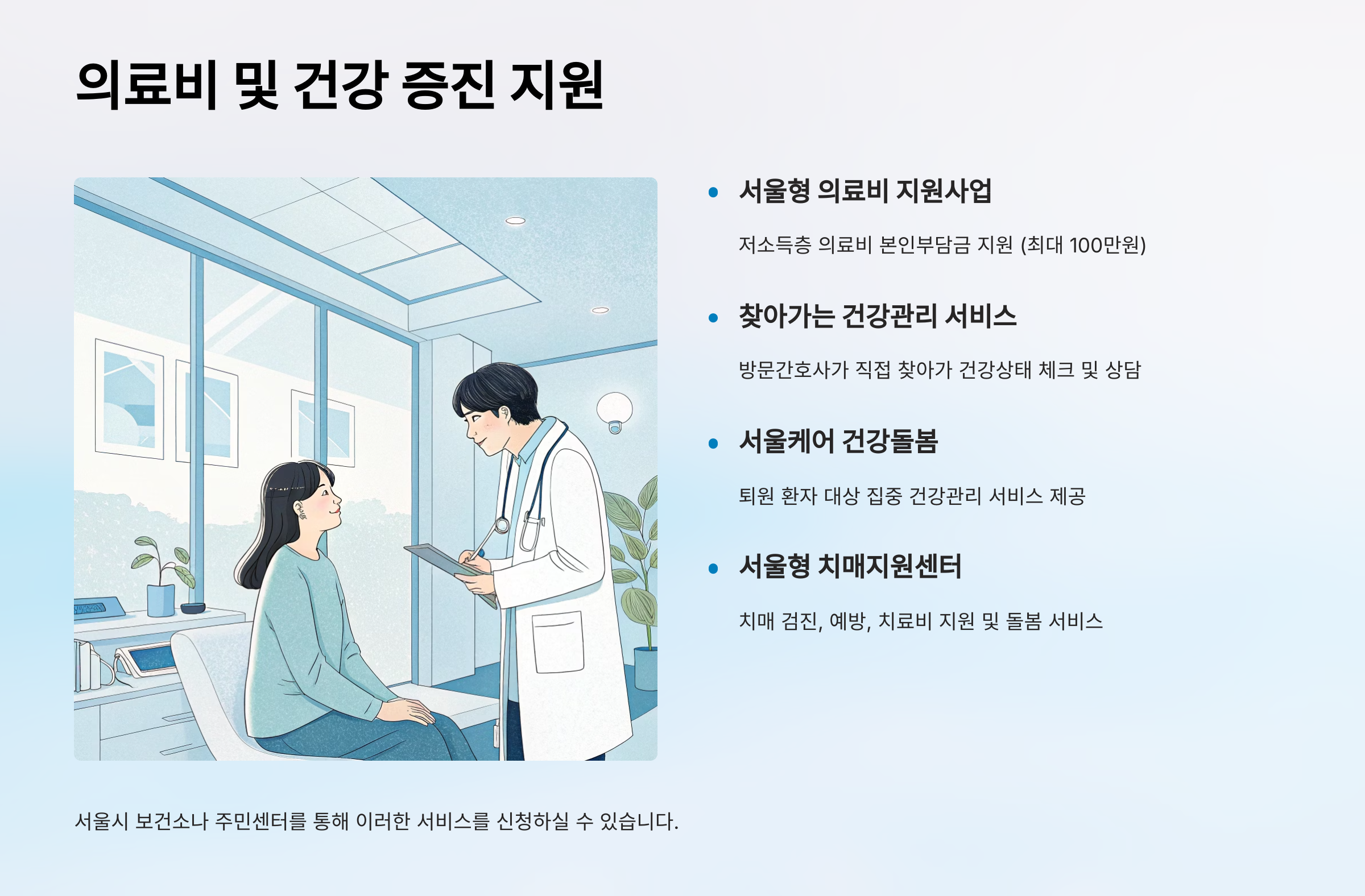 건강은 행복한 삶의 기본 전제입니다. 서울시는 시민들의 건강을 지키고 의료비 부담을 덜어주기 위한 다양한 제도를 운영합니다.
