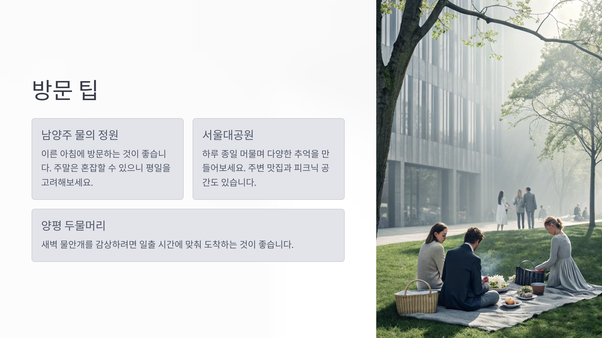 특히 봄철에는 남양주 물의 정원, 양평 두물머리와 같은 자연경관의 정수가 드러나 더욱 매력적입니다.