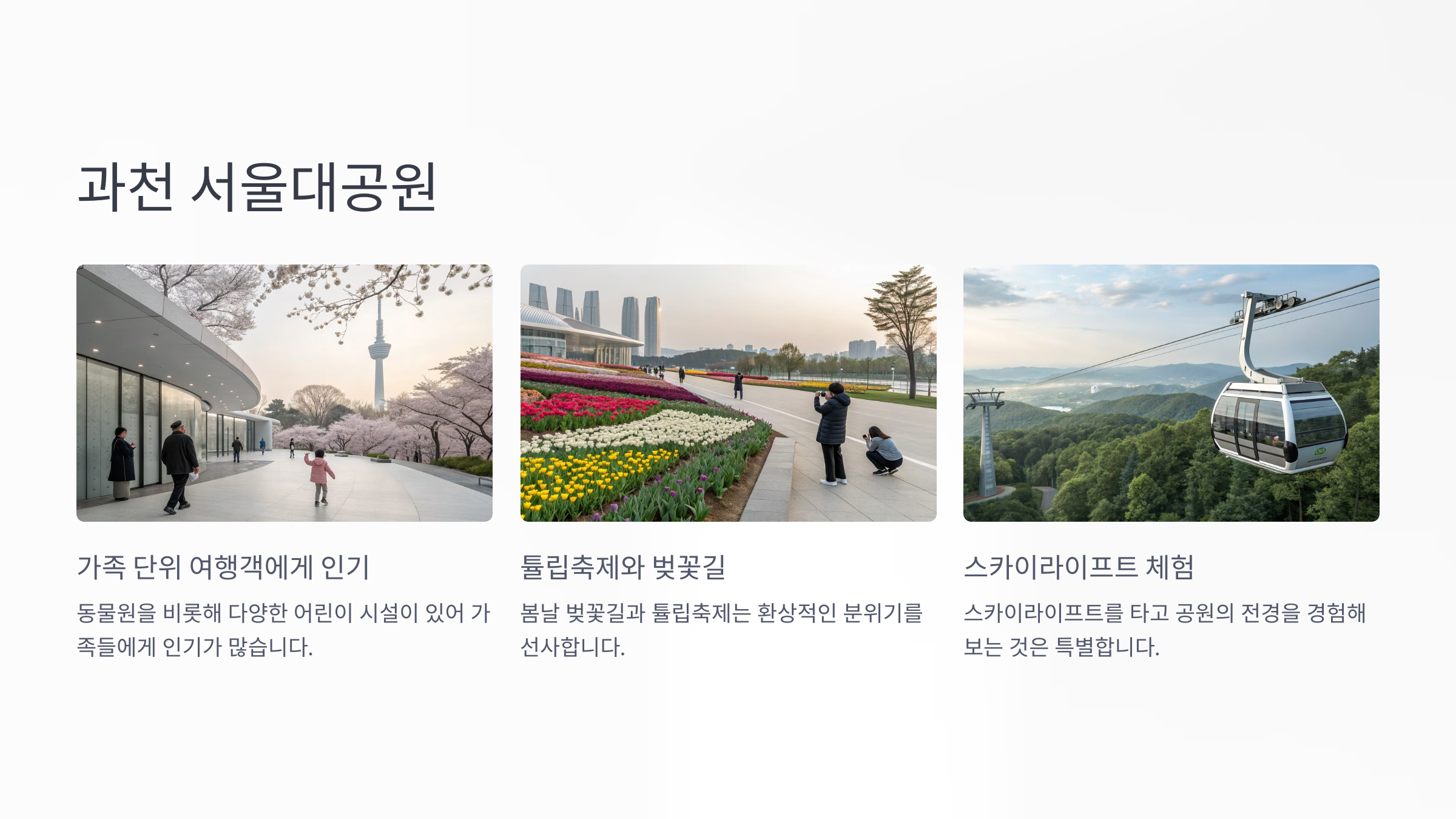 과천 서울대공원은 가족 단위 여행객들에게 추천합니다. 동물원을 비롯해 다양한 어린이 시설이 있어 어린 아이를 동반한 가족들에게 인기가 많습니다. 특히, 이곳의 벚꽃길과 튤립축제는 봄날 더욱 더 환상적인 분위기를 선사합니다.